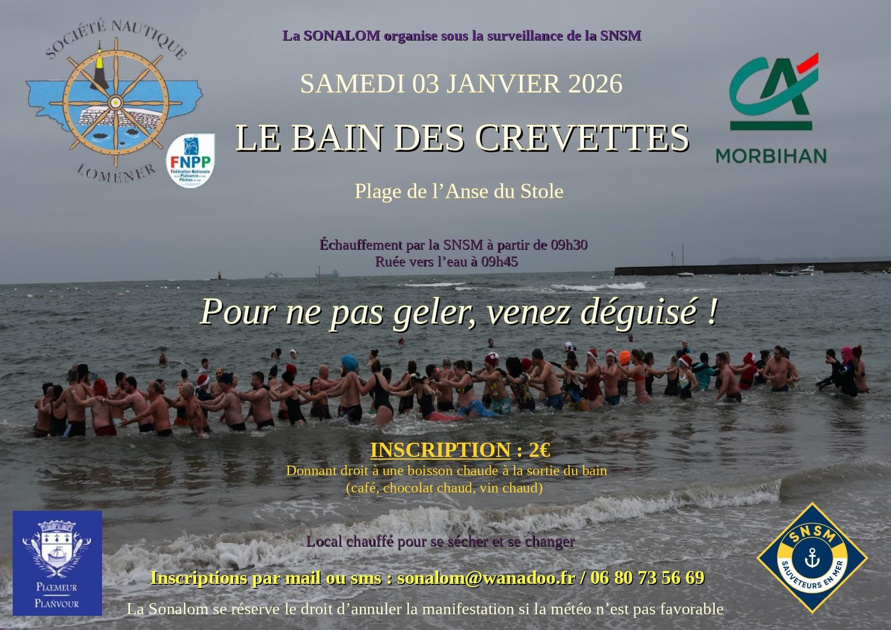 Plongez dans une ambiance conviviale et chaleureuse, avec café, vin chaud et chocolat chaud. La Sonalom organise son bain des crevettes le samedi 3 janvier 2026 à 9 h 30, plage de l’Anse du Stole à Lomener. Les participants sont encouragés à venir déguisés. L’inscription est de 2 € par baigneur et comprend une boisson chaude. La SNSM assurera la sécurité. Inscription avant le samedi 27 décembre. Contact : 06 80 73 56 69, sonalom@wanadoo.fr , http://www.sonalom.fr.