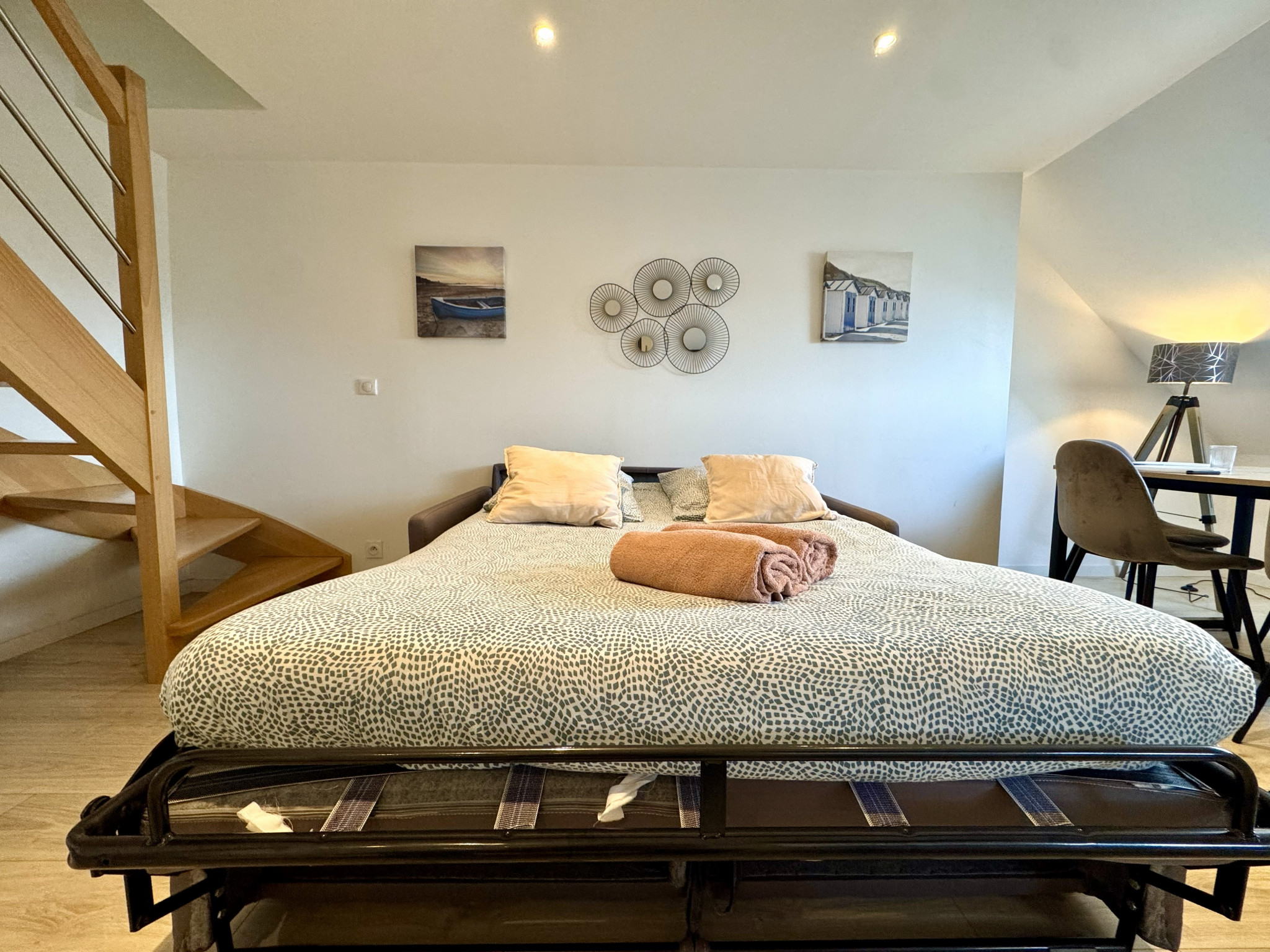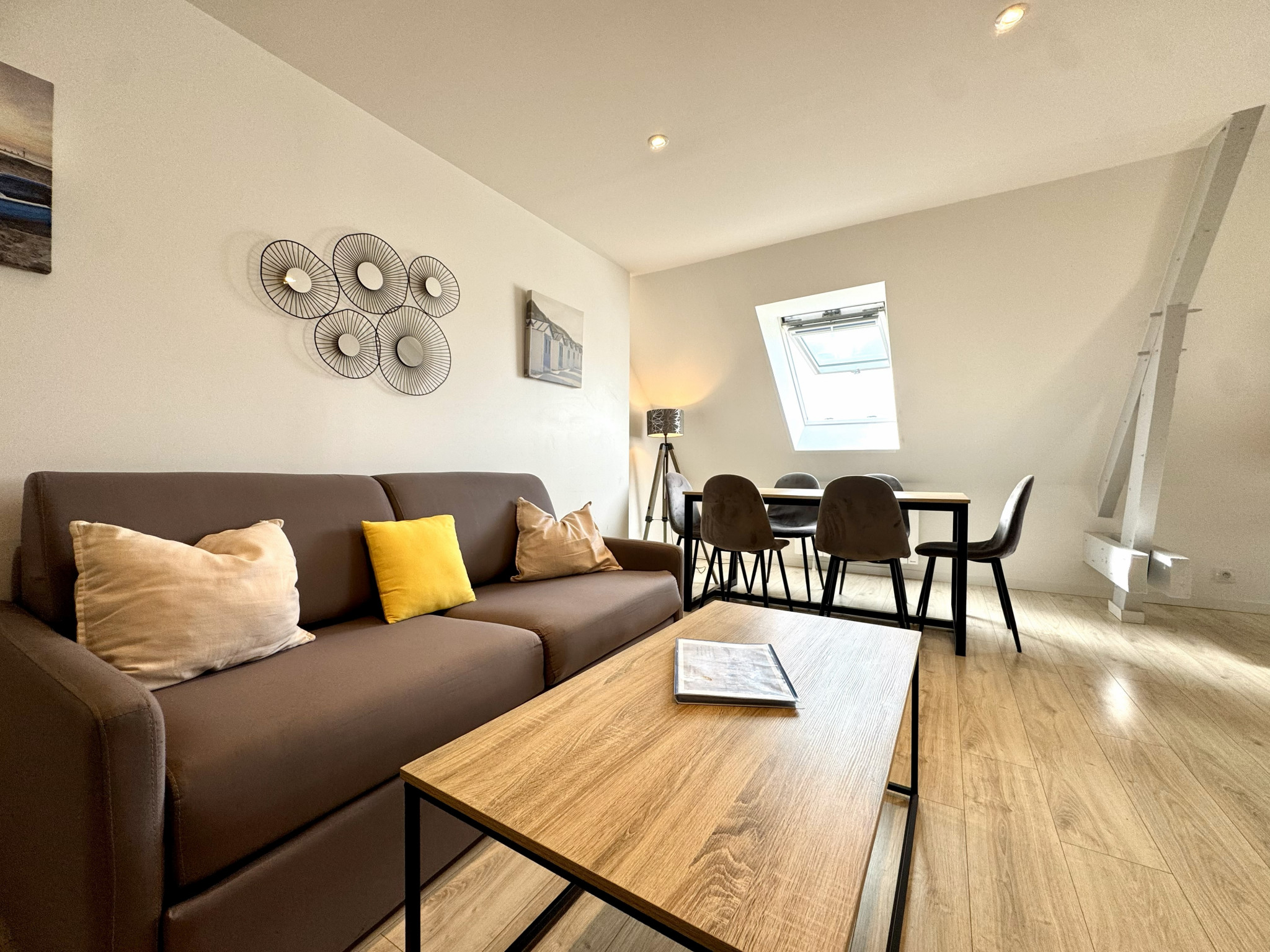 Profitez d’un grand espace lumineux doté d’un canapé convertible 2 places et d’une cuisine ouverte, toute équipée pour préparer vos repas comme à la maison, autour d’une table à manger conviviale.
