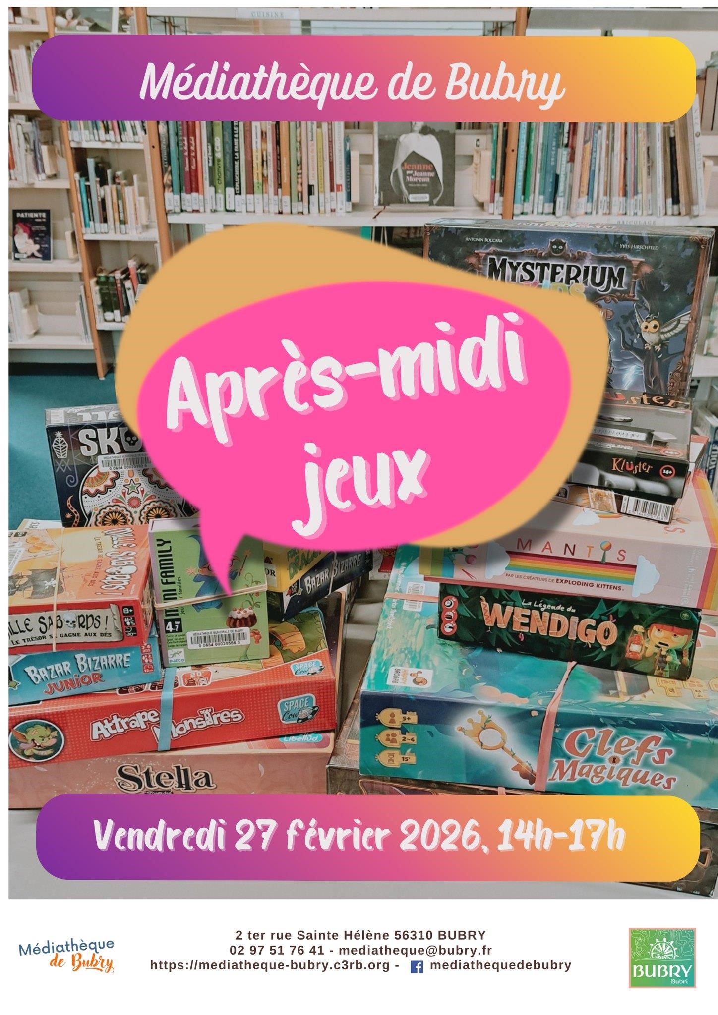 Après-midi jeux. Ouvert à tous, gratuit, avec les jeux de la médiathèque dont des nouveautés. Vendredi 27 février de 14 h à 17 h, médiathèque, 2 ter, rue Sainte-Hélène, Bubry. Gratuit. Contact : 02 97 51 76 41, mediatheque@bubry.fr, https://mediatheque-bubry.c3rb.org/.