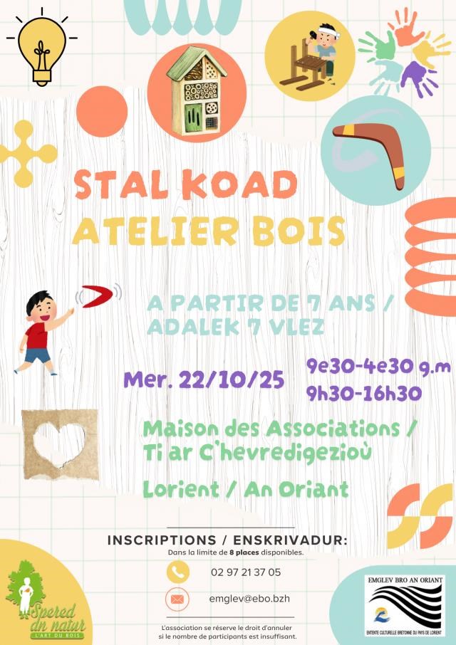 Artisanat. Emglev Bro An Oriant propose un atelier bois en langue bretonne aux enfants à partir de 7 ans. Au programme : création d’un hôtel à insectes et fabrication d’un boomerang, animé par Jeraldine de Spered an Natur. Apporter son pique-nique. Mercredi 22 octobre de 9 h 30 à 16 h 30, Maison des associations, 5 place bonneaud, Lorient. Payant. Contact : 02 97 21 37 05, emglev@ebo.bzh, https://www.emglevbroanoriant.bzh.