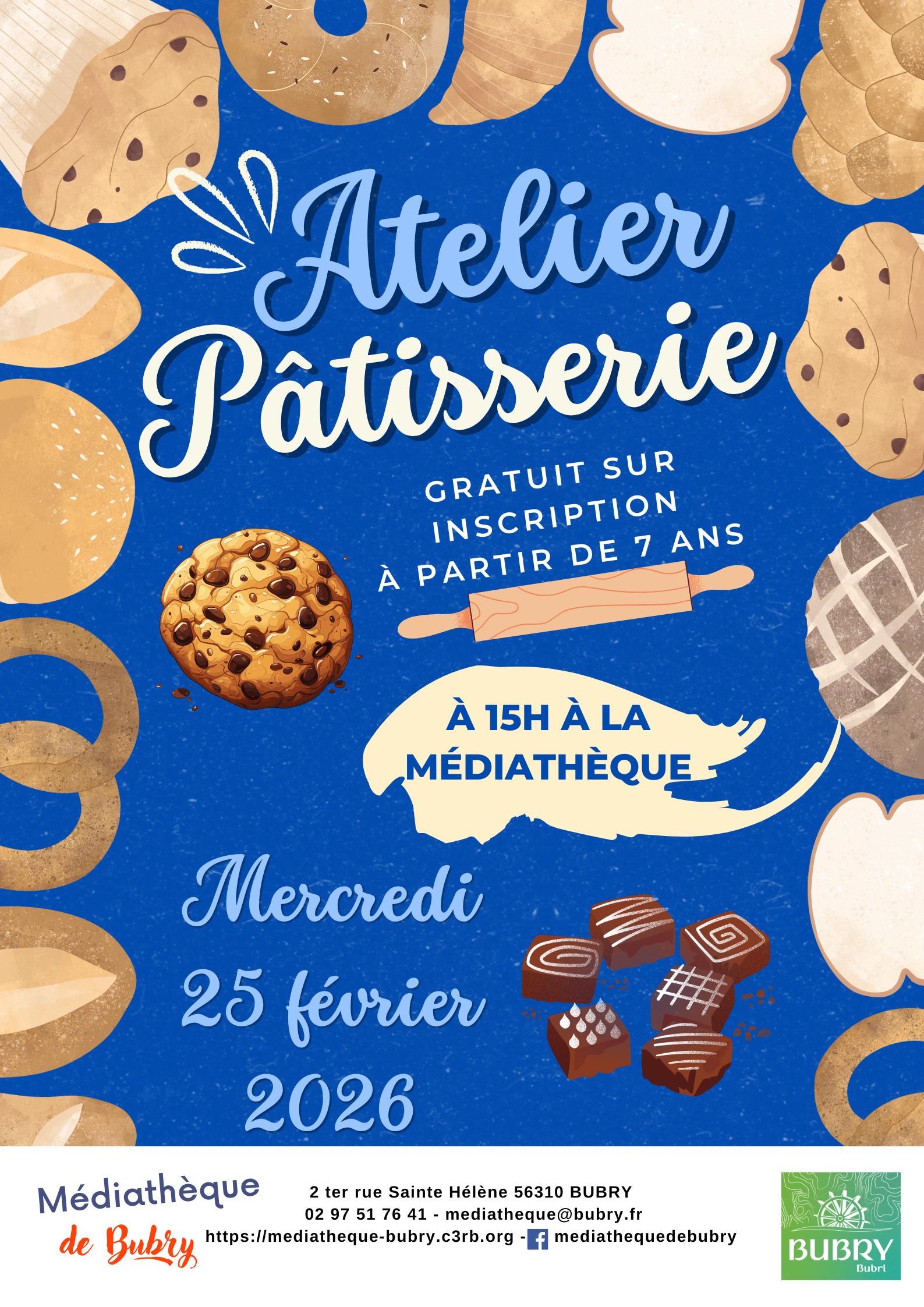 Atelier pâtisserie pour les enfants à partir de 7 ans. Sur inscription uniquement, nombre de places très limité. Mercredi 25 février à 15 h, médiathèque, 2 ter, rue Sainte-Hélène, Bubry. Gratuit. Contact : 02 97 51 76 41, mediatheque@bubry.fr, https://mediatheque-bubry.c3rb.org/.