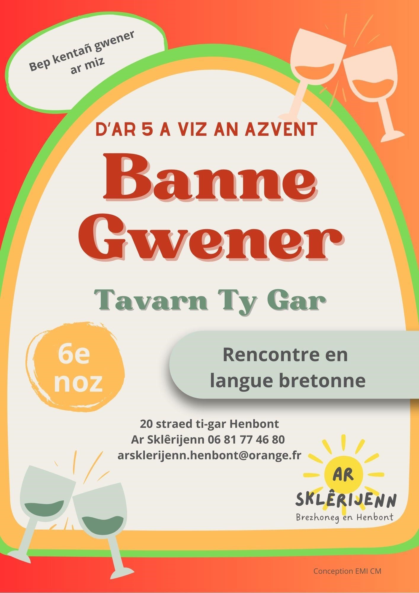 L’association Ar Sklêrijenn propose chaque premier vendredi du mois un moment pour parler en breton en toute simplicité. Accueil des bretonnants de tous âges et de tous niveaux, débutants ou confirmés, ou même toutes personnes qui le comprennent mais ne savent pas (encore) le parler.