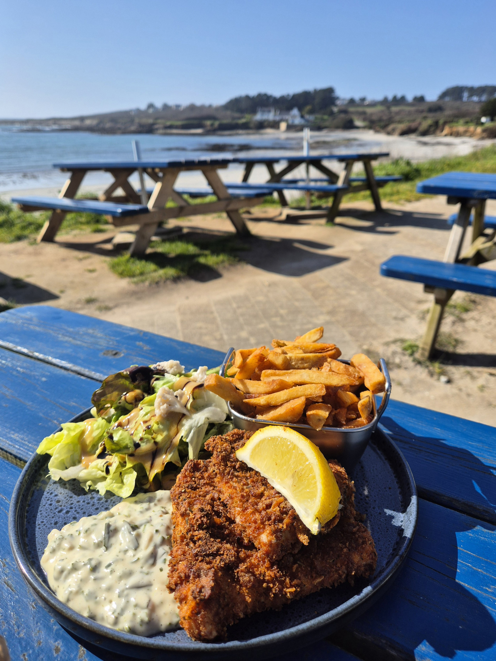 Surplombant le petit port de Locmaria, vous offrant une imprenable vue sur la plage et la mer, La Plage vous accueille été comme hiver.
