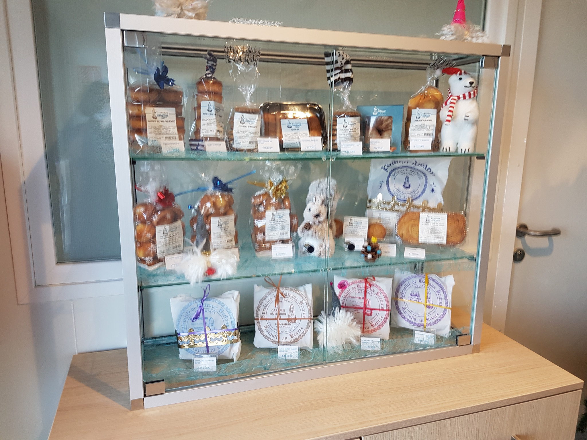 Spécialités gâteau breton d’Arzano, kouign amann, quatre-quarts (nature, fruits confits, pépites de chocolat) ; fars aux pruneaux, financiers et sablés d’Hennebont.