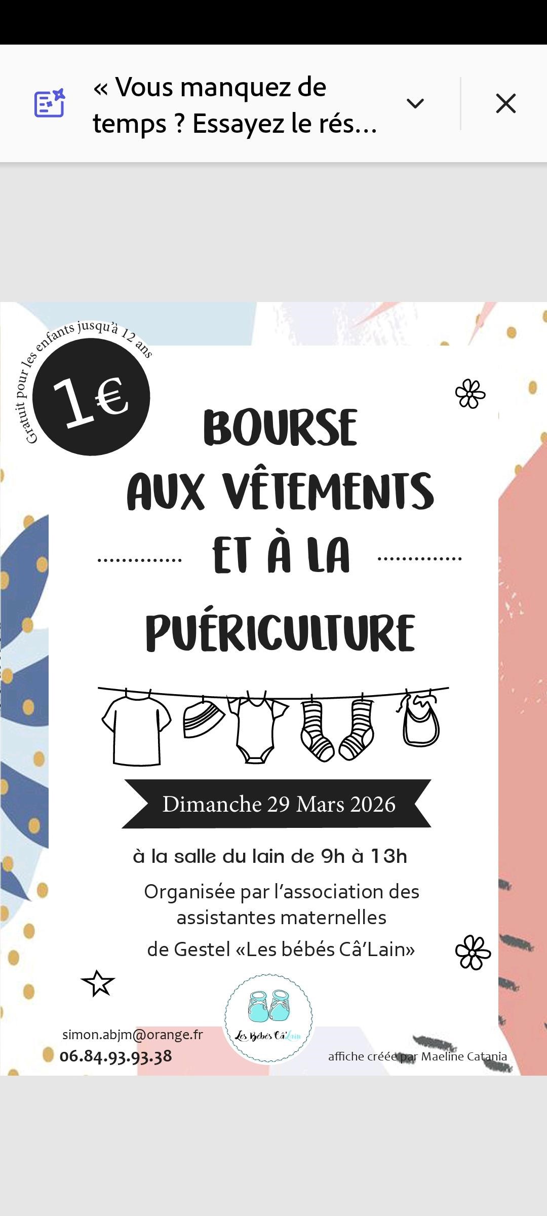 Bourse, braderie. Bourse annuelle organisée par l’association des assistantes maternelles de Gestel, Les bébé Câ’lain, afin de financer divers ateliers : éveil musical, poney, relaxation, sorties asinerie, parc du Quinquis, etc. Dimanche 29 mars de 9 h à 13 h, salle polyvalente du Lain, parking du Lain, face à l’ALSH, Gestel. Tarif 1€, réduit 0€, Gratuit moins de 12 ans : gratuit. Contact : 06 84 93 93 38, simon.abjm@orange.fr.