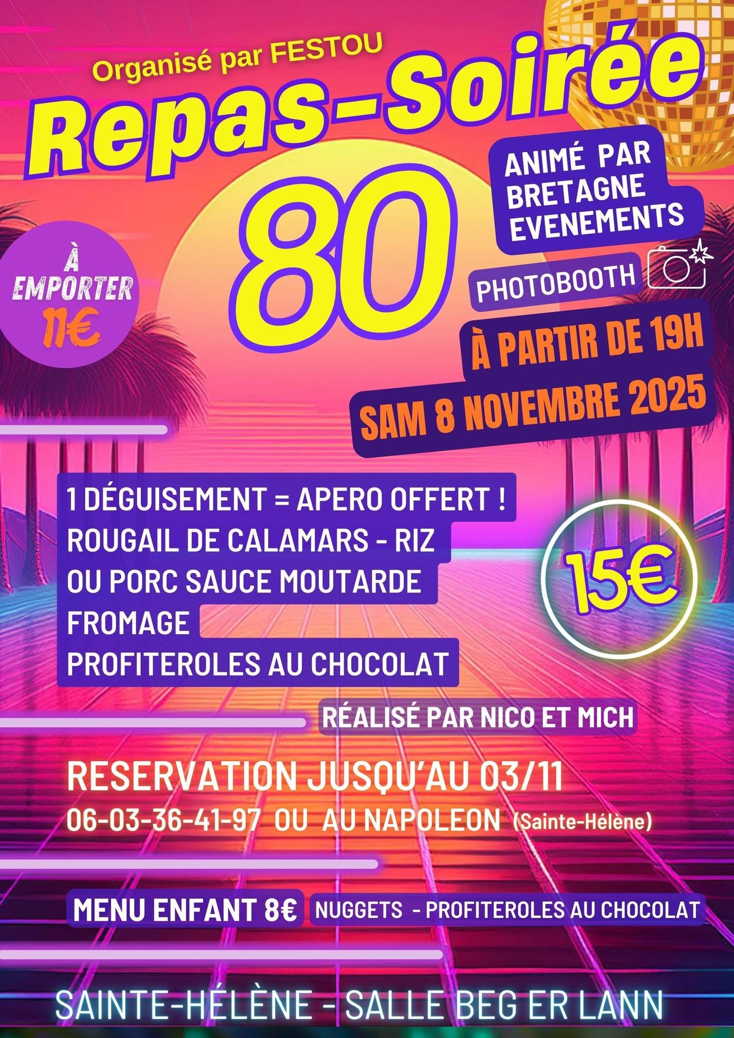 La soirée sera animée par Bretagne évènements. Venez déguiser et danser sur les tubes des années 80.