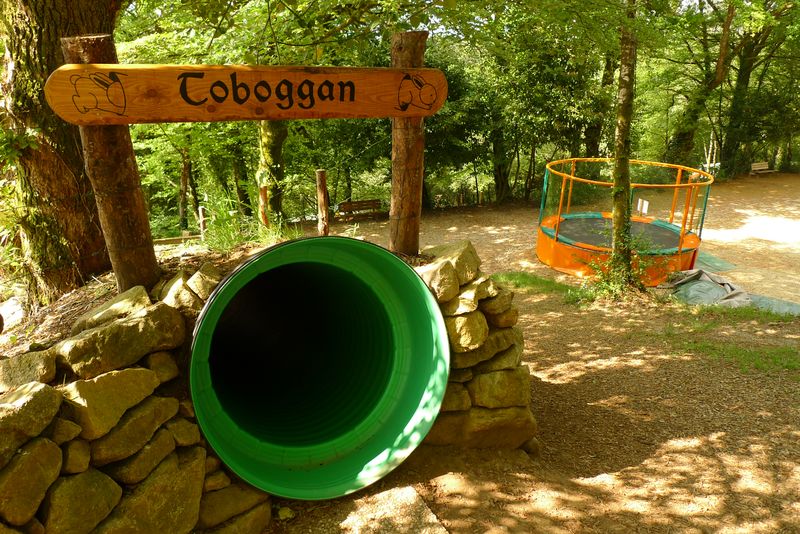 Une grande aire de jeux avec trampoline, toboggan, tourniquet pour les petits, terrain de badminton, ping pong et boules pour les plus grands.