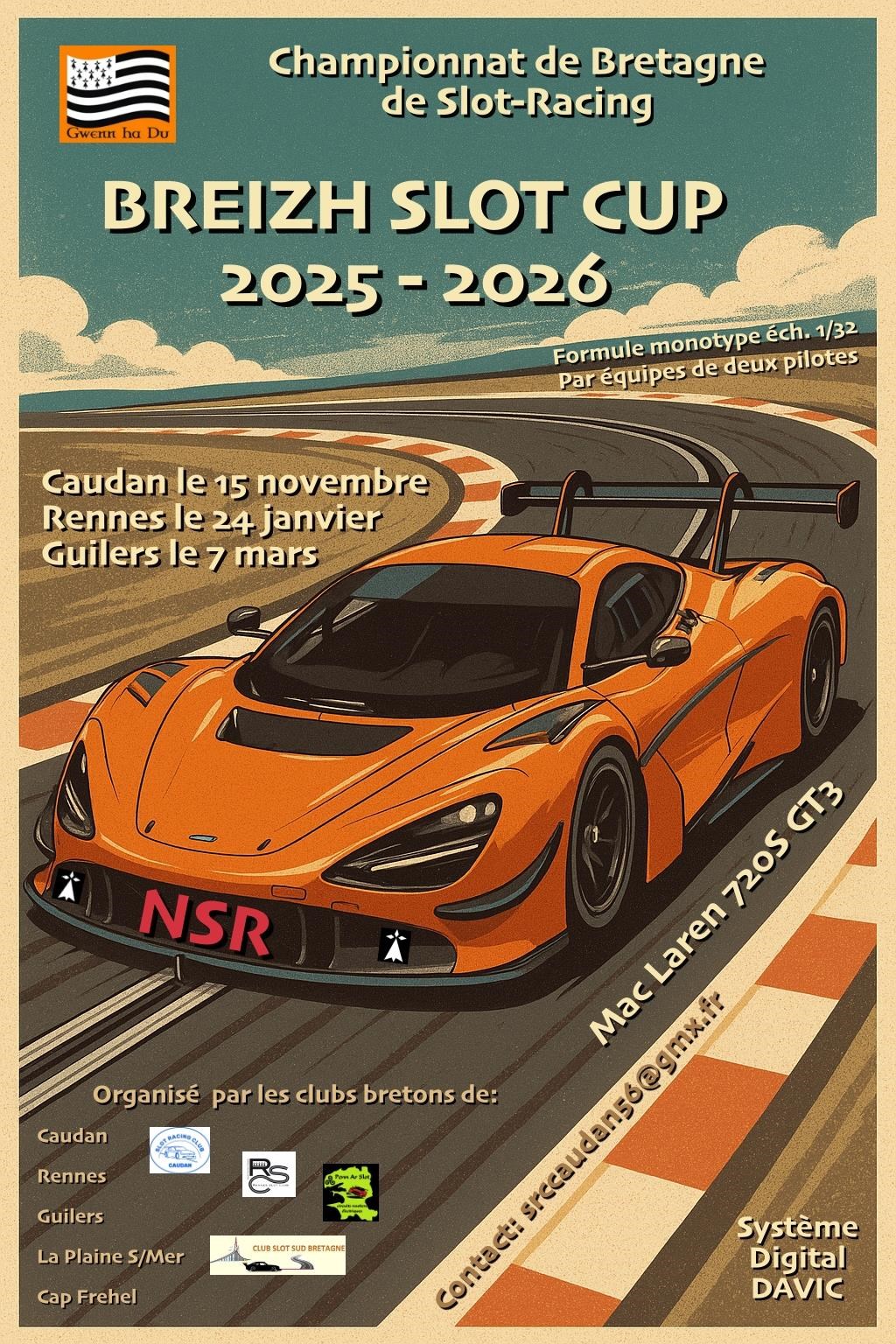 Conjointement organisée par les clubs bretons de Caudan, Guilers, Rennes, La Plaine/mer et Cap Frehel, aura lieu à Caudan le samedi 15 novembre, la 1re manche de la 2e édition de la Breizh Slot Cup, (Championnat de Bretagne de Slot-Racing Digital) sur la piste du Slot Racing Club de Caudan (Espace Rostand). Quinze équipes/32 pilotes se disputeront cette première manche avec des modèles réduits à l’échelle 1/32 de Mac Laren 720 S du fabricant NSR.