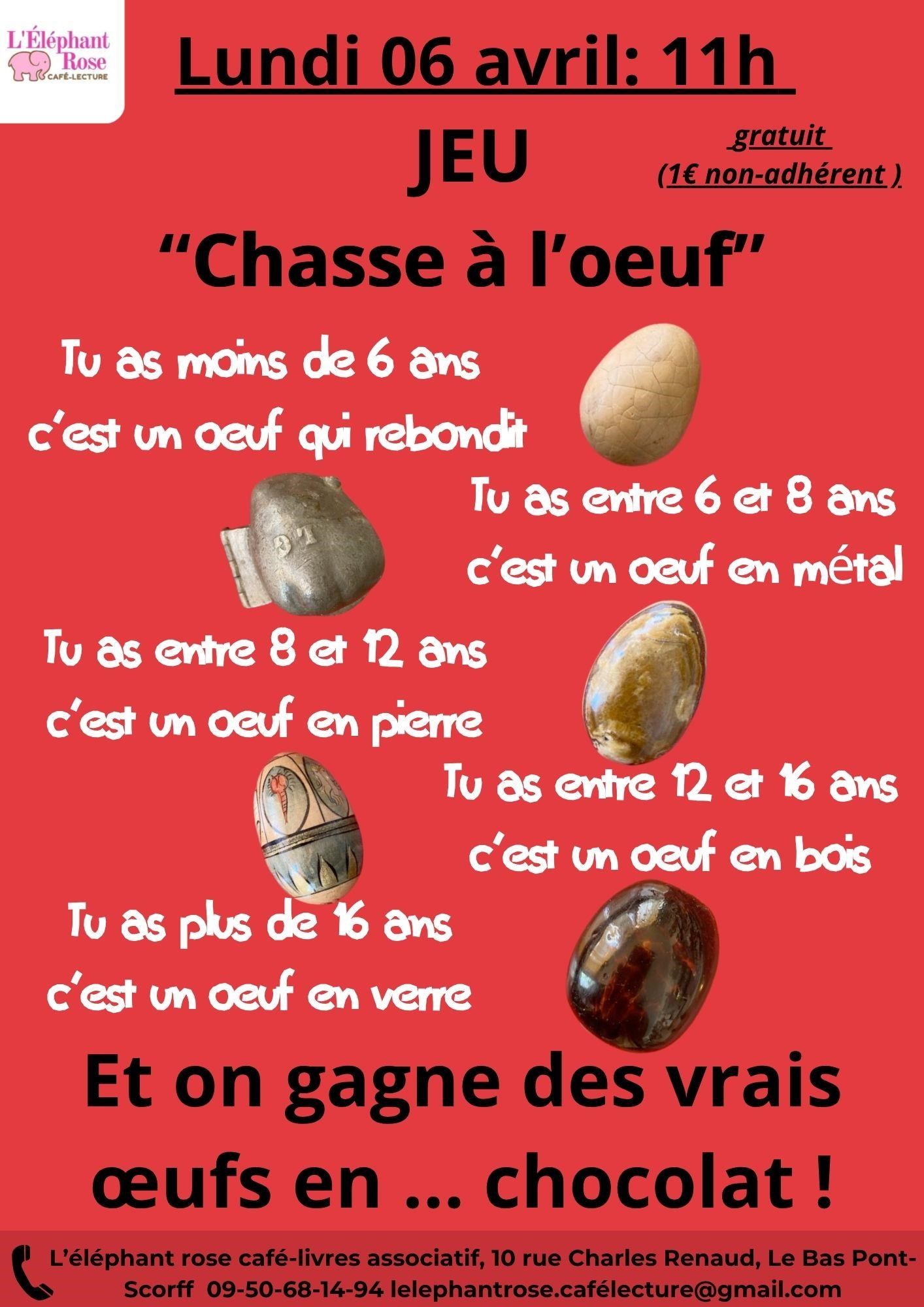 Chasse aux oeufs. Un œuf par catégorie d’âge à trouver dans le jardin ou au café. Des œufs en chocolat à gagner. (1 € non adhérent). Lundi 6 avril à 11 h, café associatif l’Éléphant rose, 10, rue Charles-Renaud, Le Bas Pont-Scorff, Cléguer. Gratuit. Contact : 09 50 68 14 94, lelephantrose.cafelecture@gmail.com.