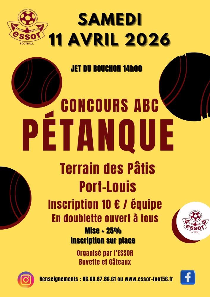 Concours de pétanque ABC en doublette. Inscription sur place à partir de 13 h 30, jet du bouchon à 14 h. Engagement : 10 € par équipe. Prix : mise + 25 %. Sur place, buvette, gâteaux