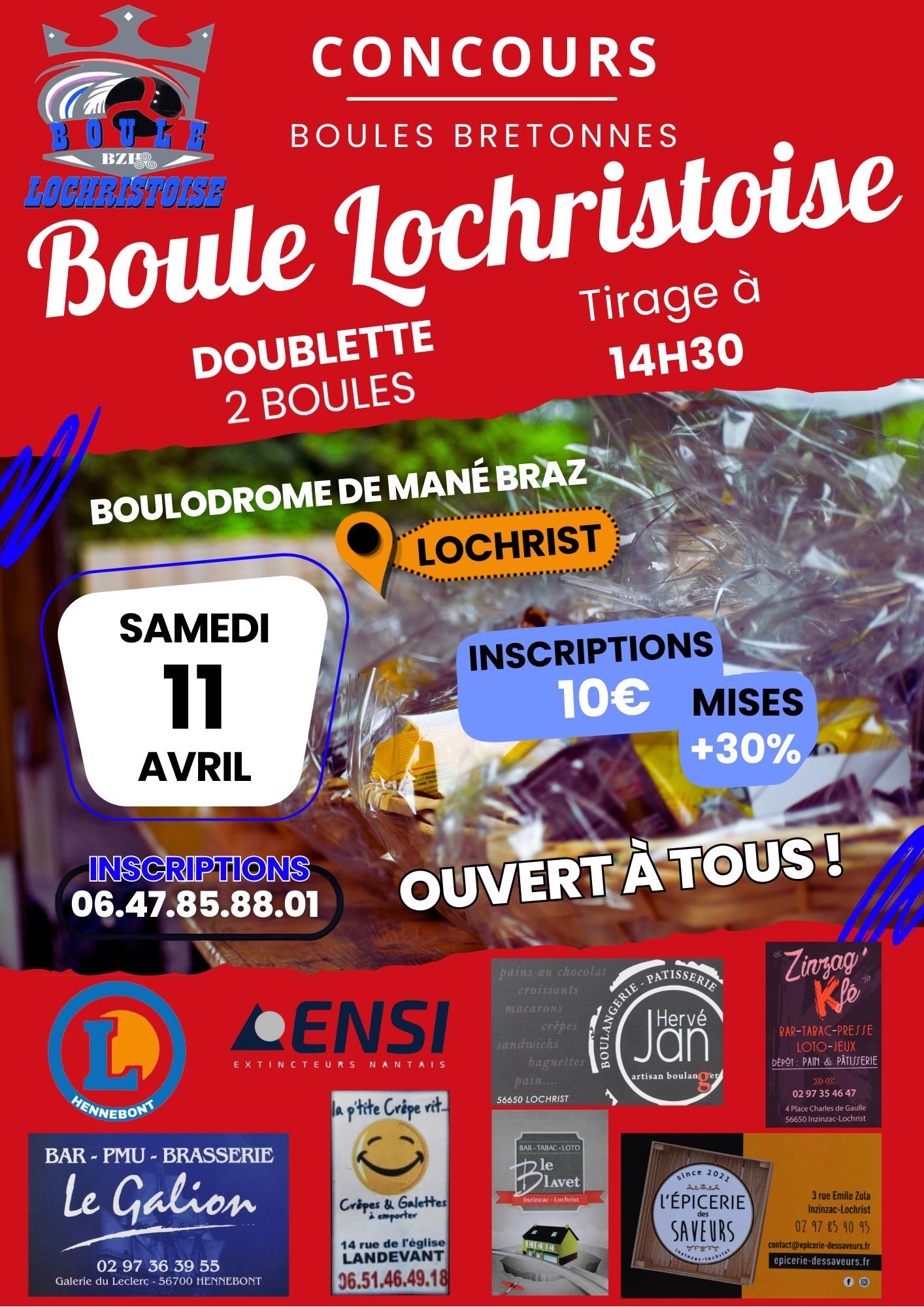 La Boule Lochristoise organise un concours régional le samedi 11 avril en doublettes (2 boules) à partir de 14 h.