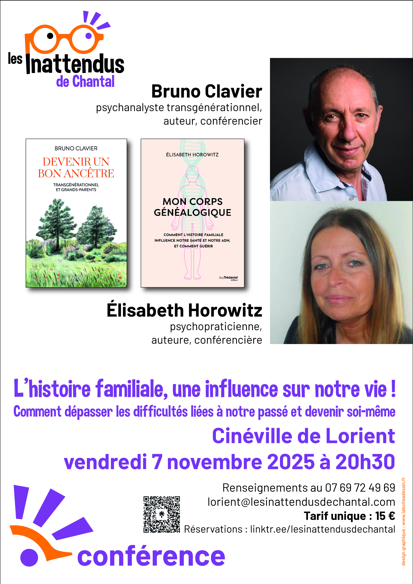 S’appuyant sur vingt-cinq ans de recherches, Elisabeth HOROWITZ, psychopraticienne, spécialisée en psychogénéalogie et transgénérationnel, révèle comment les évènements sensibles et les secrets se répercutent à travers les générations, affectant notre corps et notre métabolisme, dès notre conception. Une fois notre lignée analysée, comment aller plus loin et amorcer une guérison. Son livre « Mon corps généalogique, comment l’histoire familiale influence notre santé et notre ADN, et comment en guérir » est passionnant. Elle s’exprimera à ce titre lors de la conférence en présence de Bruno CLAVIER, psychanalyste transgénérationnel, auteur de très nombreux livres dont « les fantômes familiaux ».