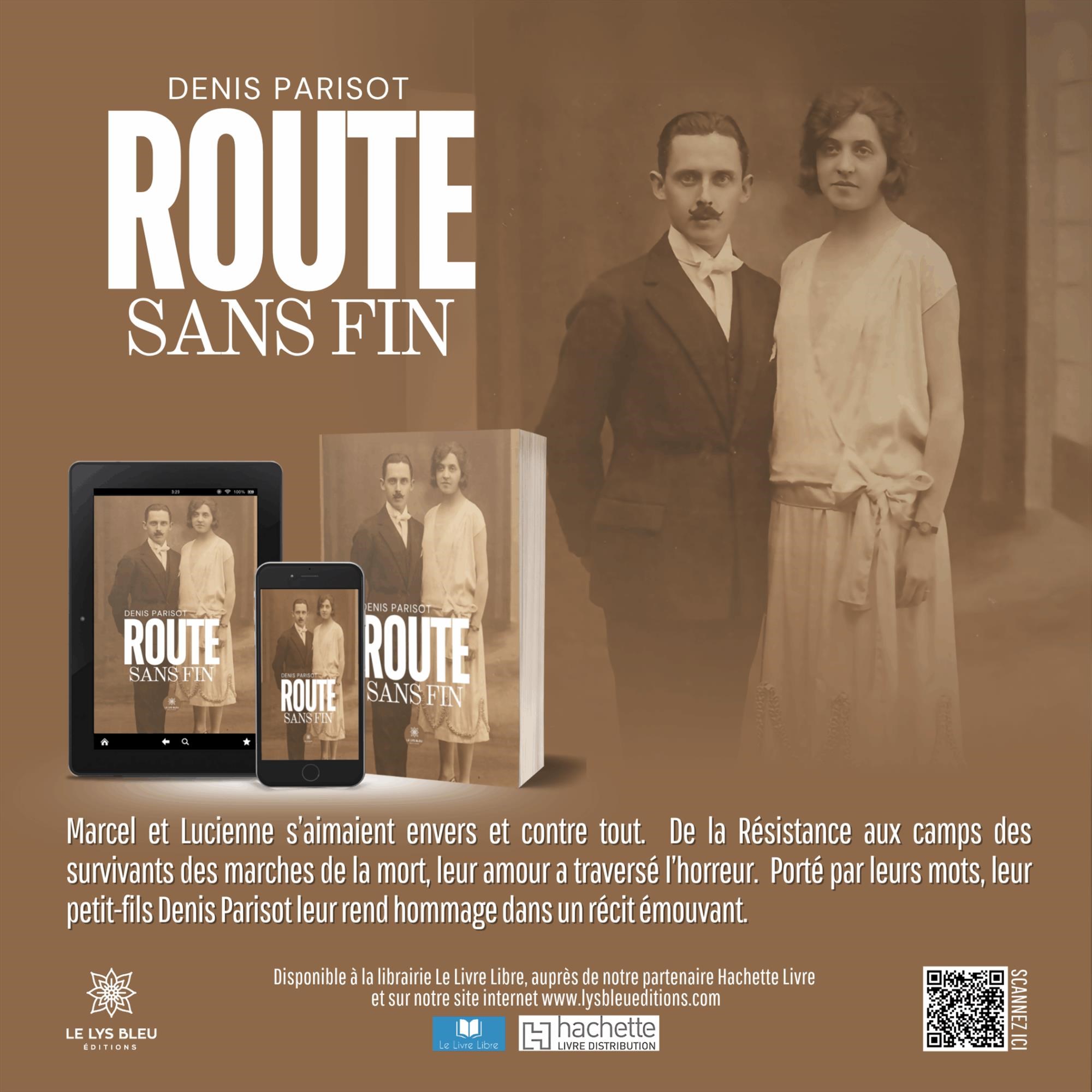 « La Route sans fin » est un poème de la survie qui a permis à Lucienne, grand mère maternelle de l’auteur de supporter la déportation puis les Marches de la mort. Elle l’a remis entre ses mains au soir de sa vie. Denis Parisot a découvert, enfant puis adolescent la puissance des mots. Il a rencontré la philosophie et la poésie, comme par hasard, et son professeur au lycée a complété l’œuvre intime du poème.