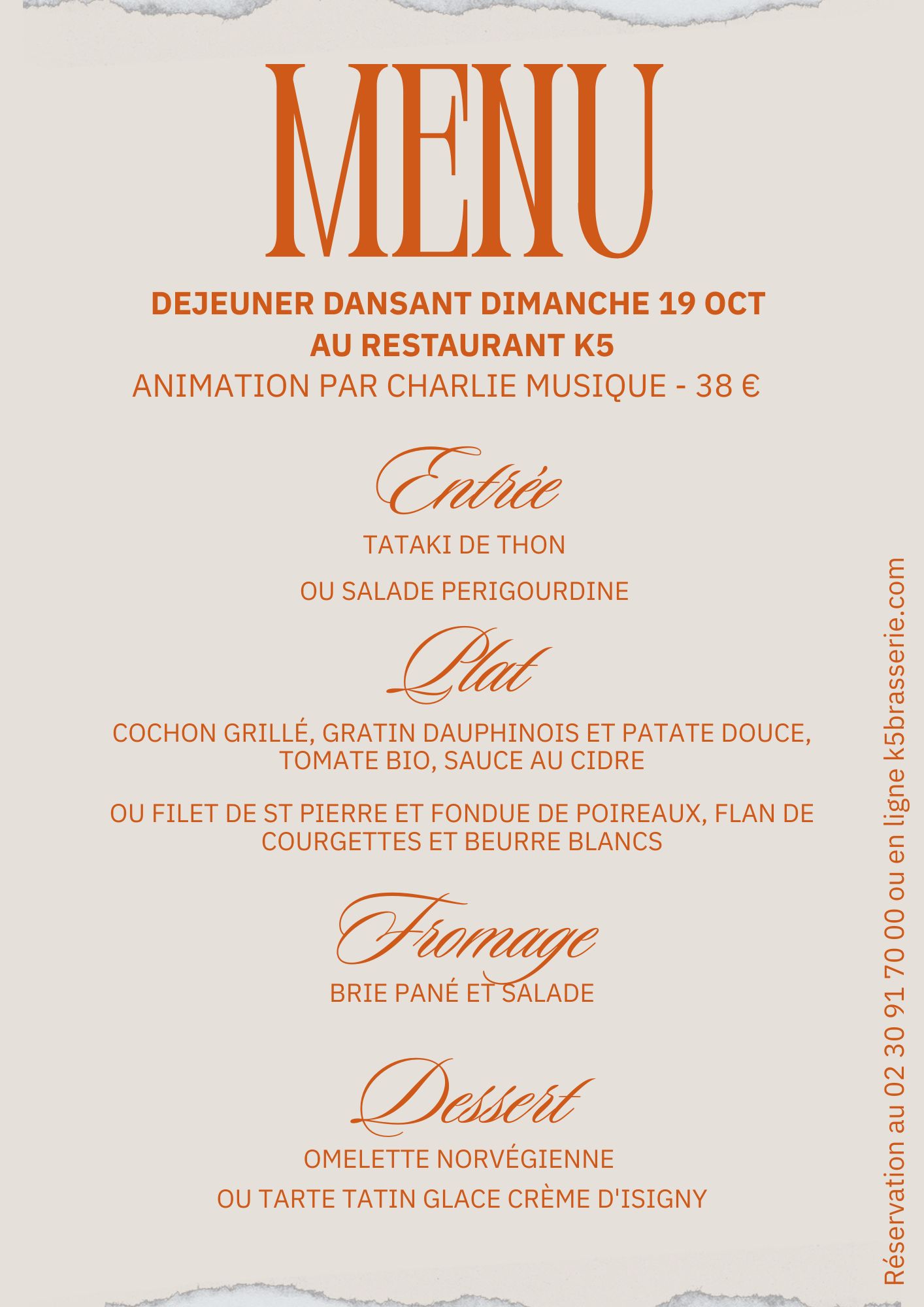 Tarif 38€ tout compris (apéritif, entrée, plat, fromage, dessert, café et vin ).