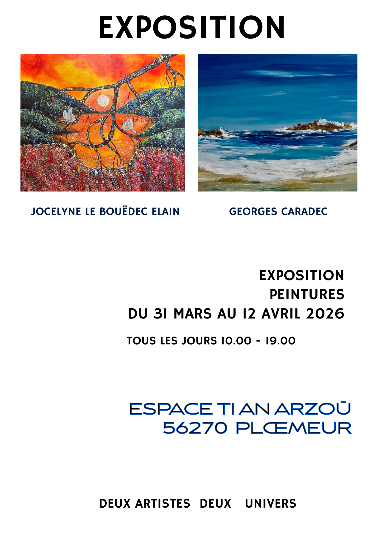 Exposition de peintures à Ti An Arzoù 56270 Plœmeur. Deux Peintres Jocelyne LE BOUËDEC ELAIN et Georges CARADEC.