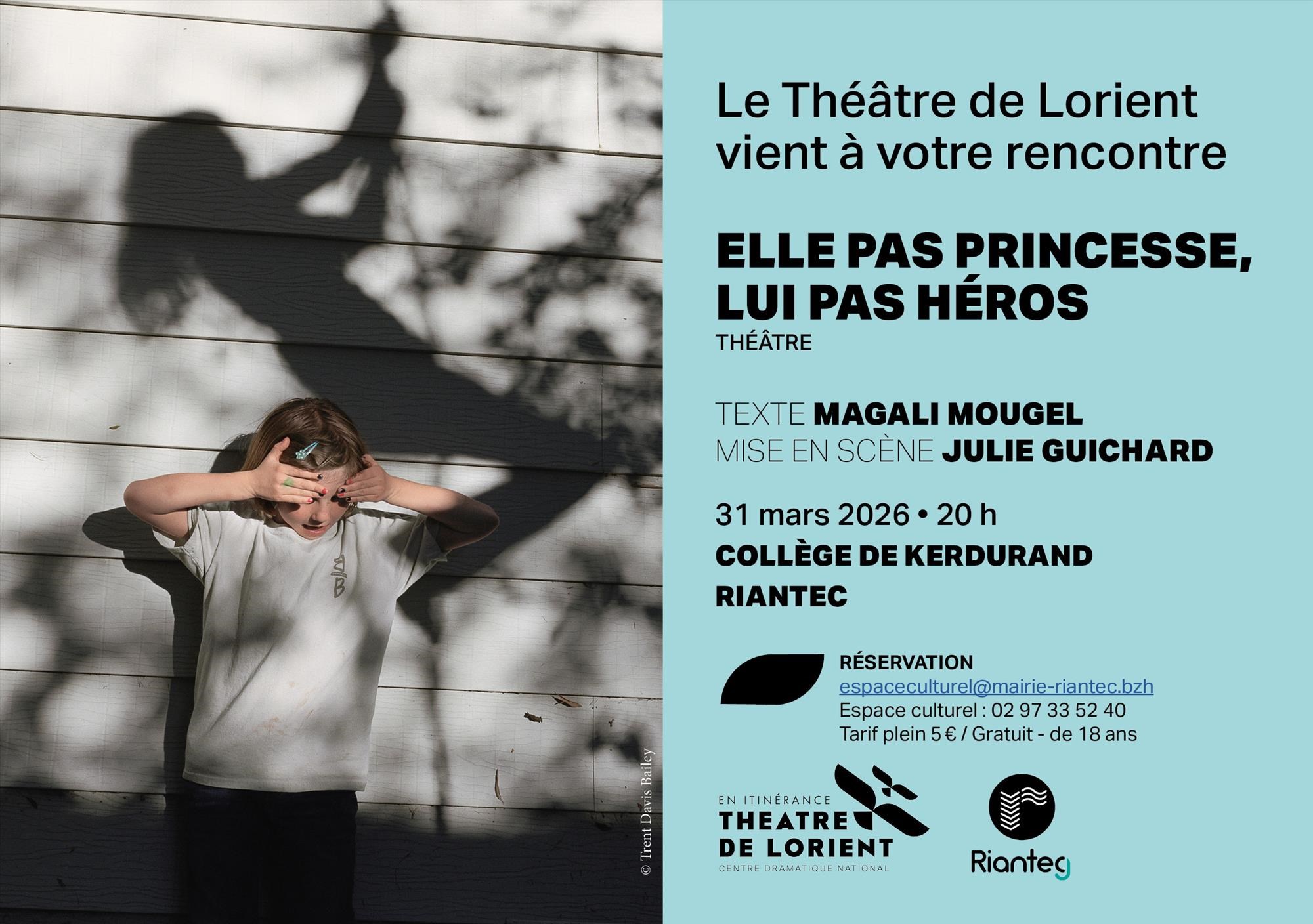 Théâtre. Pièce « Elle pas princesse, lui pas héros » avec le Théâtre de Lorient. Dès 7 ans. Texte : Magali Mougel. Mise en scène : Julie Guichard. Comédiens : Irène Le Goué et Pierre-Alexandre Culo. Mardi 31 mars à 20 h, amphithéâtre du collège de Kerdurand, collège de Kerdurand, Riantec. Tarif 5€, Gratuit moins de 18 ans : gratuit. Réservation avant le lundi 30 mars. Contact : 02 97 33 52 40, espaceculturel@mairie-riantec.bzh.