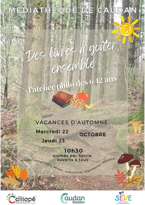 Animation. Pendant les vacances, les goûters philo de la médiathèque permettent de retrouver les copains. Ouverts à tous, de 6 à 12 ans et animés par Sylvie, le groupe grossit petit à petit pour échanger autour d’un thème adapté à l’âge des enfants, discuter et finir par un petit goûter. Mercredi 22 octobre de 10 h 30 à 11 h 30, jeudi 23 octobre de 10 h 30 à 11 h 30, médiathèque, rue de Preist, Caudan. Gratuit. Contact : 02 97 80 50 55, mediatheque-jeunesse@caudan.fr, https://calliope.bzh.