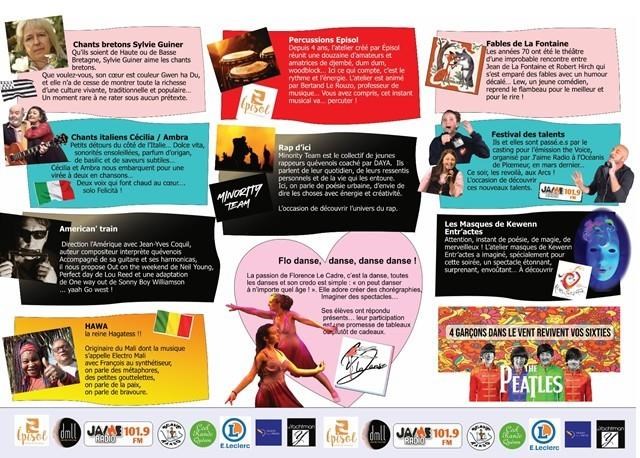Ce concert réunira pas moins de 81 talents sous forme de 12 tableaux. La programmation concoctée par Décroche-moi la lune sera très éclectique : folk, rap, rock, chansons françaises, italiennes, maliennes, bretonnes, anglo-saxonnes, danse, percussions, théâtre… sans oublier la présence de trois des chanteurs sélectionnés pour The Voice.