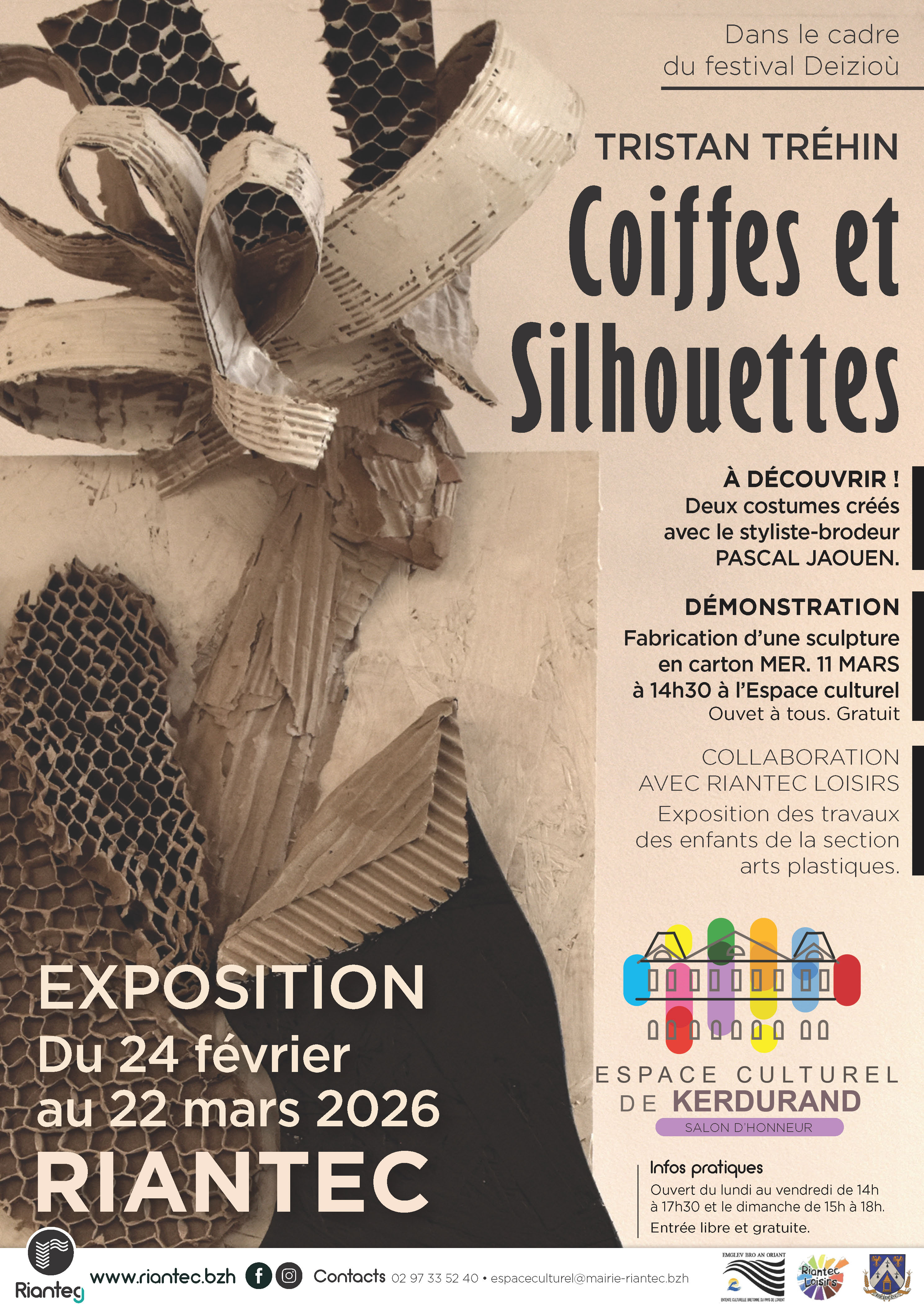 Entre imaginaire sauvage et matières brutes, l’artiste Tristan Tréhin invite le public à une immersion poétique dans l’univers du carton.Avec Coiffes et silhouettes, sa toute dernière exposition, il explore le thème du costume traditionnel à travers le monde et les époques. En Bretagne, le costume est un symbole fort : reflet d’une histoire, d’un savoir-faire, mais aussi d’une ouverture sur le monde. L’habit n’est jamais neutre : il exprime, revendique et relie.Tristan Tréhin nourrit cette réflexion en travaillant le carton brut de manière directe et expressive, donnant vie à des silhouettes étonnantes et habitées, animées d’un perpétuel mouvement.Le petit plus : Deux costumes en carton et coquillages, créés avec le styliste-brodeur Pascal Jaouen et portés lors de la cérémonie des Priziou 2025, seront exceptionnellement exposés à l’espace culturel.L’exposition « Coiffes et silhouettes » est ouverte au public du lundi au vendredi de 14h à 17h30 et le dimanche de 15h à 18h en présence de l’artiste.Originaire de Bretagne, Tristan Tréhin a grandi au cœur des récits et légendes locales.Diplômé d’une école de cinéma d’animation et passionné par la stop-motion, il s’intéresse à différentes techniques – gravure, peinture, sculpture – avant de se consacrer au carton brut. Fasciné par sa lumière, ses teintes et textures, il l’utilise comme un matériau à part entière. Actuellement, il collabore avec Pascal Jaouen sur une collection autour de la mer et du recyclage.