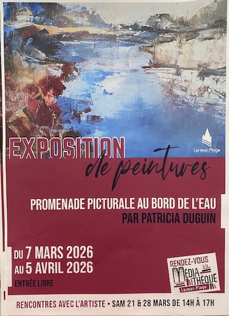 Sur le thème, promenade picturale au bord de l’eau, venez découvrir les peintures de Patricia Duguin. Une quarantaine d’oeuvres à l’huile travaillées au couteau. Médiathèque de Larmor Plage du 07 mars 2026 au 05 avril 2026. Présence les samedis 21 et 28 mars de 14h00 à 17h00, démonstrations et échanges avec l’artiste.