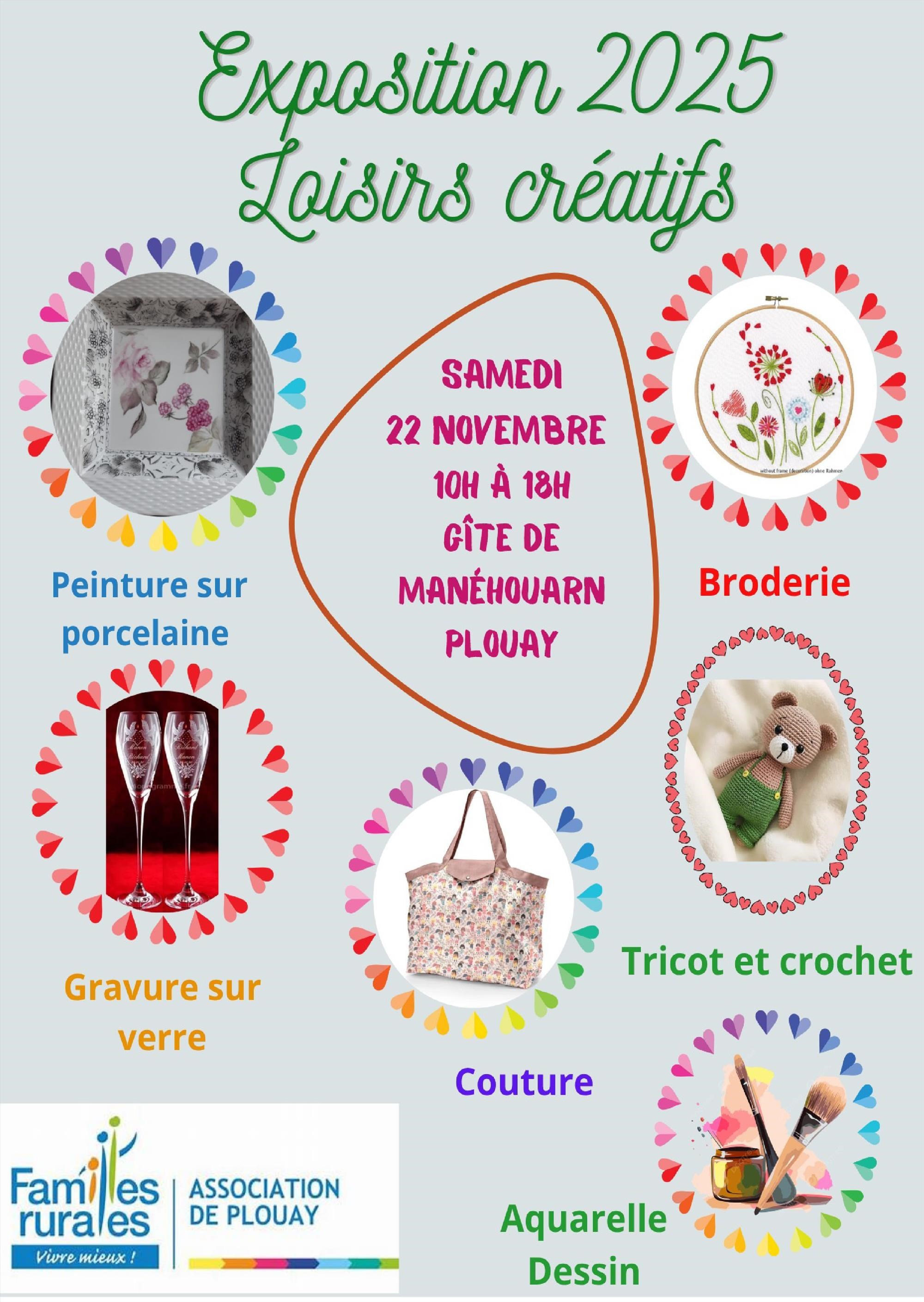 Exposition. L’association Familles rurales expose toutes ses activités de loisirs créatifs : peinture sur porcelaine, gravure sur verre, broderie, couture, tricot et crochet, aquarelle et dessin. Le tirage de la tombola aura lieu en fin de journée. Samedi 22 novembre de 10 h à 18 h, salle de réunion, gîte du domaine de Manéhouarn, Plouay. Gratuit. Contact : 02 97 33 15 45, afrplouay@gmail.com, http://www.famillesrurales.org/plouay.