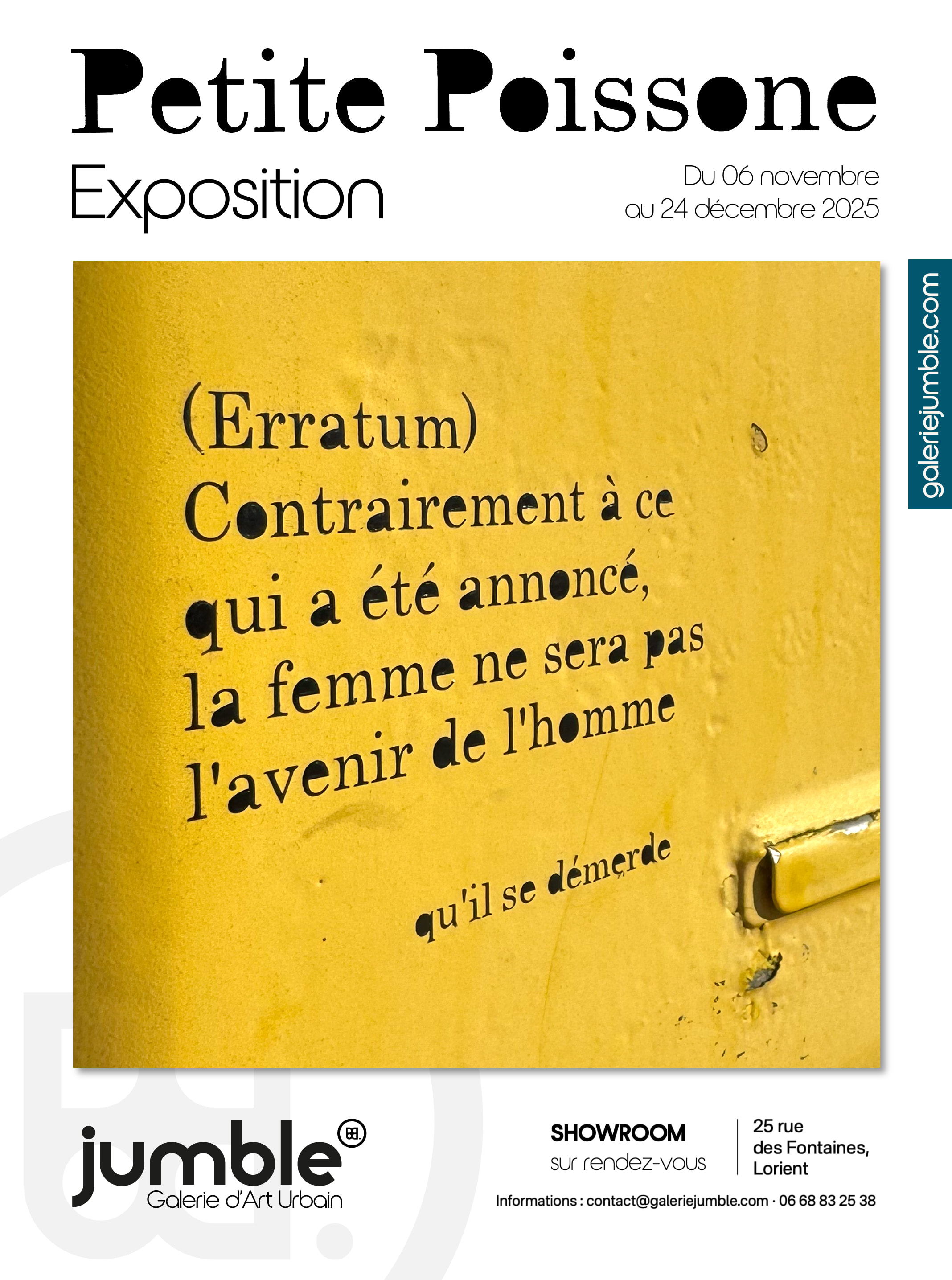 La Galerie Jumble, spécialisée en art urbain, est ravie de vous convier à une nouvelle exposition dédiée à la street artiste grenobloise Petite Poissone, dont le travail se déploie entre texte, pochoir et humour visuel.