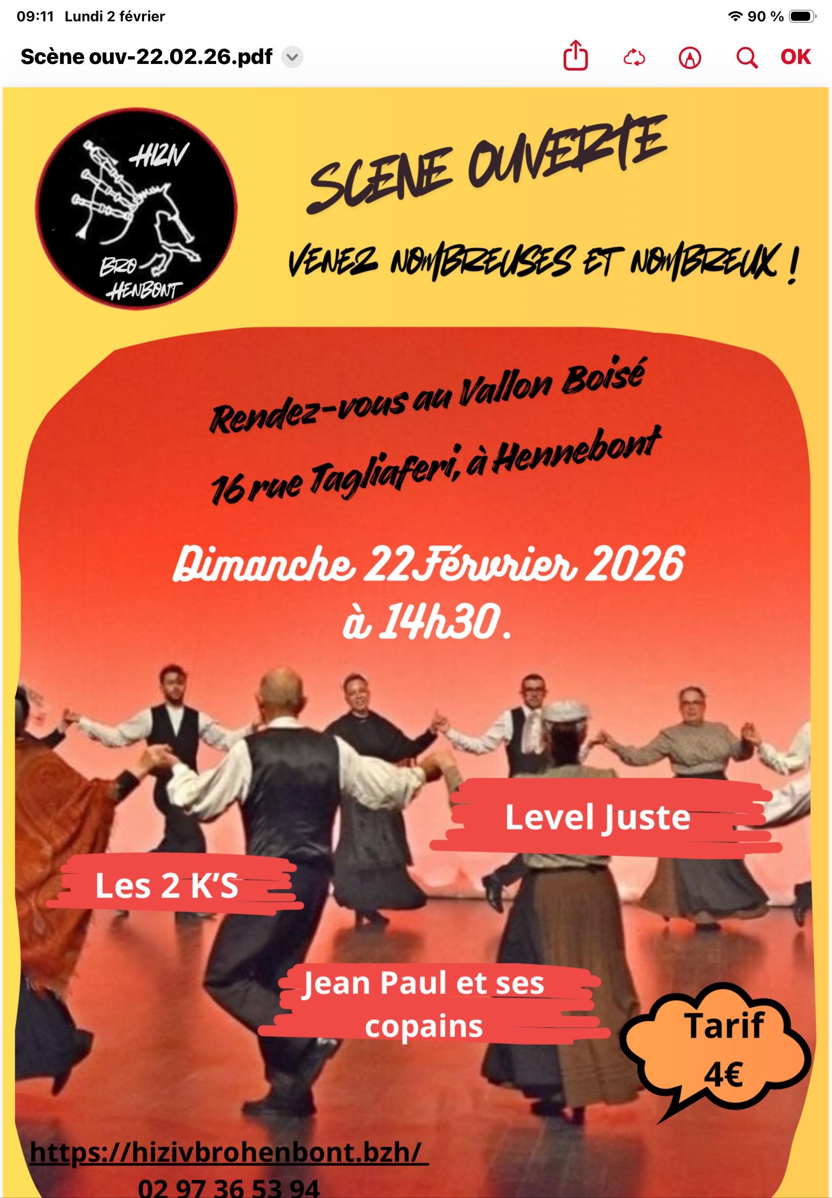 Hiziv Bro Henbont vous invite à participer à sa scène ouverte, le 22 février 2026 à 14 h 30, au Vallon Boisé à Langroix. Les groupes musicaux sont Juste Level, Les 2’KS, Jean Paul et ses copains.