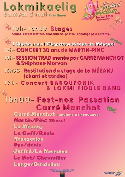 Le samedi 2 mai à Locmiquélic, la salle de l’Artimon accueillera des stages de 10 h à 16 h : photographie, kan ha diskan et musique de Haute-Bretagne, ainsi que des ateliers pour enfants. À partir de 18 h, place à un fest-noz avec notamment Carré Manchot et le duo Martin-Pinc.