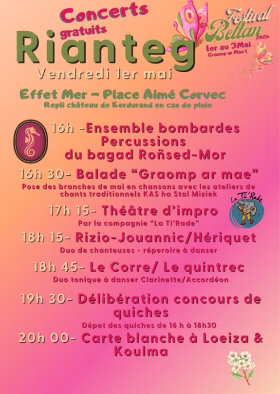 Le vendredi 1er mai à Riantec, rendez-vous à l’Effet Mer dès 16 h pour des concerts gratuits. Une procession distribuera des branches d’aubépine à 16 h 30, suivie d’un spectacle d’improvisation à 17 h 15.