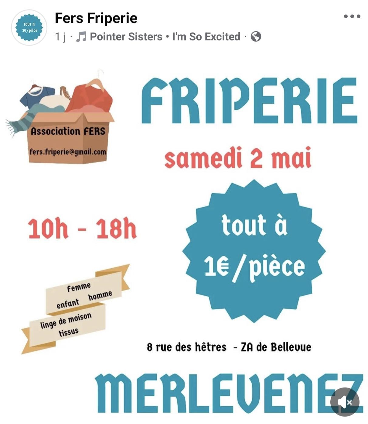 Friperie : articles pour homme, femme et enfant. Linge de maison, chaussures. Prix unique : 1 €. Des bonnes affaires tout en donnant une seconde vie aux vêtements. Samedi 2 mai de 10 h à 18 h, Z.A de Bellevue, 8, rue des Hêtres, Merlevenez.