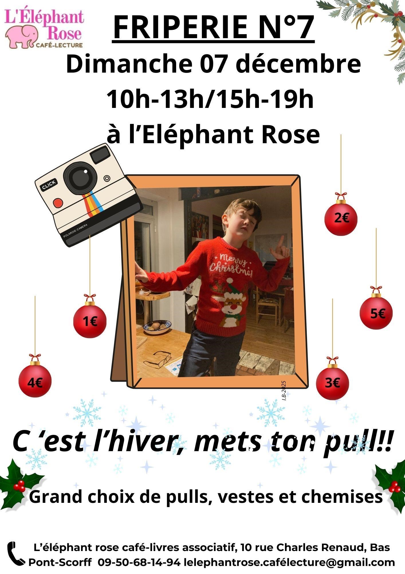 Bourse, braderie. C’est la friperie ce dimanche au café lecture, l’Éléphant Rose. Des pulls, vestes et chemises pour l’hiver à prix solidaires. Dimanche 7 décembre de 10 h à 13 h , de 15 h à 19 h, Bas Pont-Scorff, 10, rue Charles-Renaud, Cléguer. Gratuit. Contact : 09 50 68 14 94, lelephantrose.cafelecture@gmail.com.
