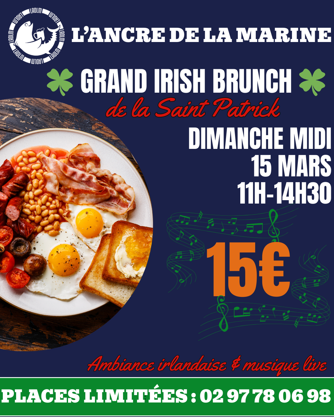 Dimanche 15 mars, L’Ancre de la Marine fête la Saint-Patrick autour d’un grand Irish brunch convivial. Entre amis, en famille ou après une balade sur les sentiers de Groix, venez partager un moment chaleureux au rythme de l’Irlande.De 11h30 à 14h30, service en continu : un généreux petit-déjeuner irlandais vous attend avec œufs, bacon, saucisse, haricots à la tomate, tomates rôties, champignons, pommes de terre, toast et café ou thé. Un repas complet, gourmand et réconfortant pour bien profiter de votre dimanche.L’ambiance sera assurée par de la musique live et des airs traditionnels, pour retrouver l’atmosphère d’un pub irlandais sans quitter l’île. L’occasion de se retrouver, discuter et prolonger le week-end dans une atmosphère simple et festive.Tarif unique : 15 €.Places limitées, réservation conseillée au 02 97 78 06 98
