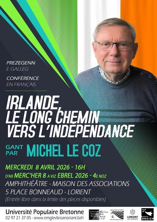 Conférence histoire. L’Irlande, seule partie de l’Europe de l’Ouest à ne pas avoir été conquise par les Romains. Elle finira par acquérir enfin sa pleine indépendance après 1921 et la création de l’état libre d’Irlande. Michel Le Coz nous propose de parcourir quelques faits marquants. Mercredi 8 avril à 16 h, maison des associations, 5, place Bonneau, Lorient. Gratuit. Contact : 02 97 21 37 05, emglev@ebo.bzh, http://www.emglevbroanoriant.bzh.