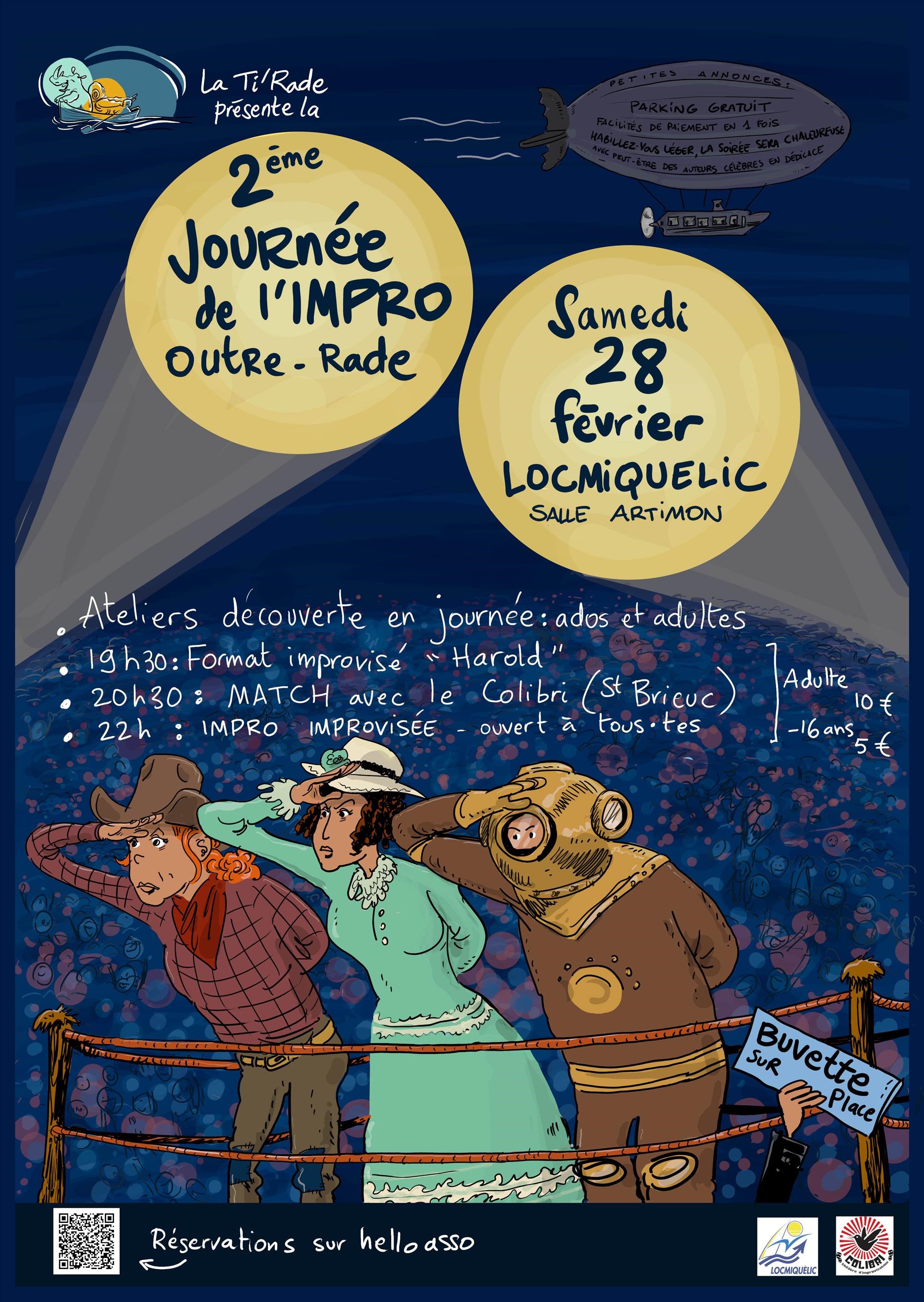 La Ti’Rade vous donne rendez-vous le samedi 28 février 2026 pour sa 2e journée de l’Impro Outre Rade. Vous y trouverez des ateliers en journée pour la découverte du théâtre d’improvisation et une soirée spectacle. Programme : Matin de 10 h à 12 h : atelier découverte du théâtre d’improvisation ados Condition : être âgé de 14 à 18 ans inclus et être débutant ~ Tarif : 10 €. Après-midi de 14 h à 16 h : atelier découverte du théâtre d’improvisation adultesCondition : être âgé de + de 18 ans et être débutant ~ Tarif : 10 € ? Le soir à 19 h 30 : Spectacles – Ouverture des portes à 19 h. À 19 h 30 : Format d’improvisation « Harold » 20 h 30 : Match d’improvisation Et après 22 h : L’impro comme vous voulez Pour les plus valeureux d’entre vous et d’entre nous on poursuit la soirée en faisant de l’impro improvisée ! Tarif : 10 € adulte / 5 € enfant (- de 16 ans) NB : les participants aux ateliers découverte auront accès gratuitement au spectacle du soir Vous trouverez aussi une buvette sur place avant le spectacle et pendant les entractes. La billetterie est en ligne sur le site Hello Asso.