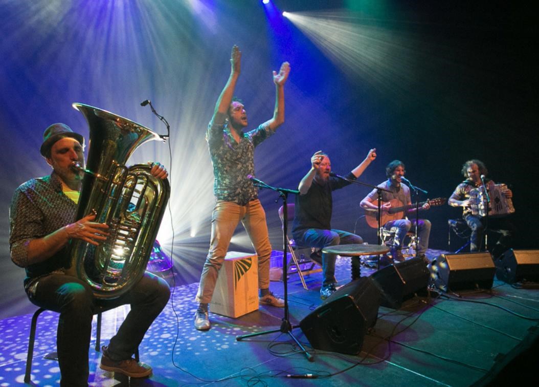Combo musical folk, nomade et festif, né sur les rives de la Laïta, est un mélange festif, énergique, chaloupant. C’est une belle énergie, et du plaisir en concert. Dans le micro… du breton – mar plij ! -, mais aussi de l’espagnol et du français, de la guitare, du tuba, de l’accordéon, du cajón.