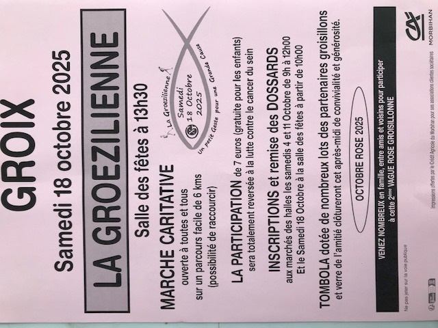 Marche caritative ouverte à toutes et à tous dans le cadre d’octobre rose. Les fonds collectés sont intégralement reversés à La Ligue contre le Cancer. Inscriptions les samedis 4 et 11 octobre aux halles de GROIX de 9h à 12h et à la salle des fêtes le 18 octobre de 10h à 12h30 : participation de 7 euros avec délivrance d’un dossard ouvrant droit au tirage de la tombola généreusement dotée par des commerçants groisillons.