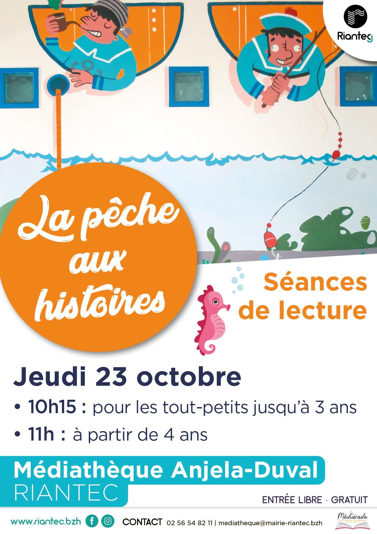 Lecture, écriture. Les enfants sont invités à venir découvrir les histoires de la pêche du jour. Deux séances: 10 h 15 pour les tout-petits jusqu’à 3 ans et 11 h : pour les enfants à partir de 4 ans. Jeudi 23 octobre de 10 h 15 à 12 h, médiathèque Anjela Duval, rue Joliot-Curie, Riantec. Gratuit. Contact : 02 56 54 82 11, mediatheque@mairie-riantec.bzh, http://www.mediarade.net.