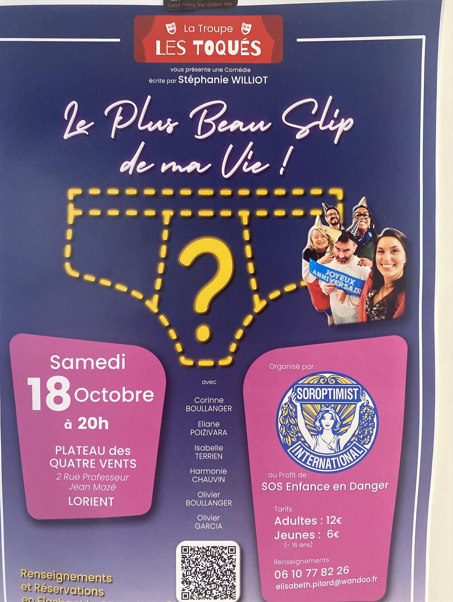 Fidèle à ses engagements dans les domaines de la Santé, l’Éducation, la Lutte contre les Violences envers les femmes et les filles, l’Autonomie et l’Environnement, le Soroptimist International Lorient – Quimperlé organise cette soirée Théâtre grâce à la pétillante Corinne Boullanger et sa troupe « Les Toqués ».