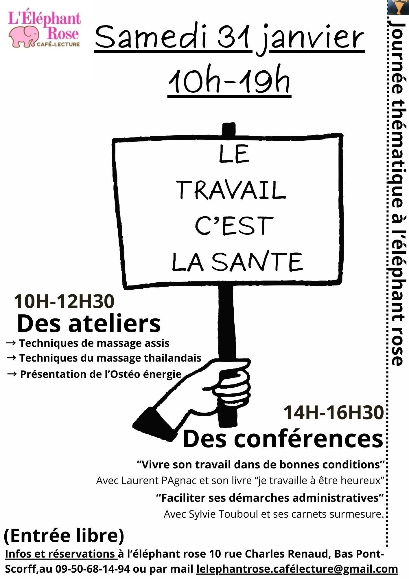 Café-débat, café-philo. Une journée à thème à l’Éléphant rose consacrée au « Bien-être au travail ». Au programme : 3 ateliers de bien-être de 10 h à 12 h 30 et 2 conférences à 14 h et 16 h 30. Ouvert à tous. Samedi 31 janvier de 10 h à 19 h, Bas Pont-Scorff, 10, rue Charles-Renaud, Cléguer. Gratuit. Contact : 09 50 68 14 94, lelephantrose.cafelecture@gmail.com.
