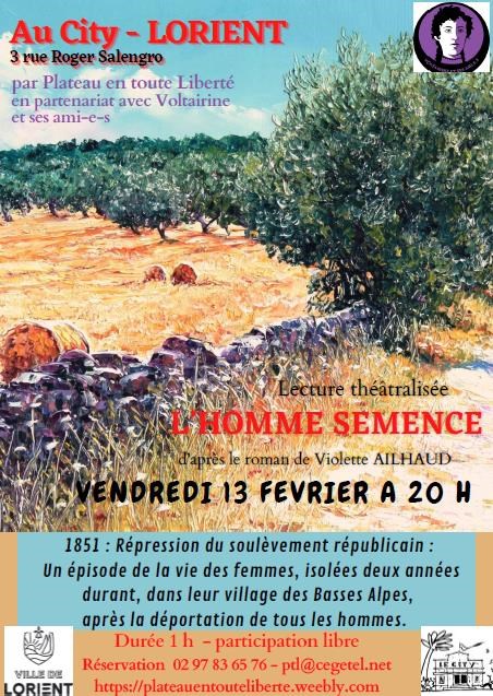Ce texte, écrit à la première personne, a été traduit en plusieurs langues et fait l’objet d’un film en 2017 (Le Semeur). Le groupe de lecture à voix haute de PTL et l’association Voltairine et ses amis l’ont adapté pour une mise en voix théâtralisée. La voix de Violette est portée ici par quatre comédiennes, bientôt rejointes par celle de l’homme semence. Véritable ode à l’amour et à l’amour, ce récit est aussi un chant d’espoir et de résistance.
