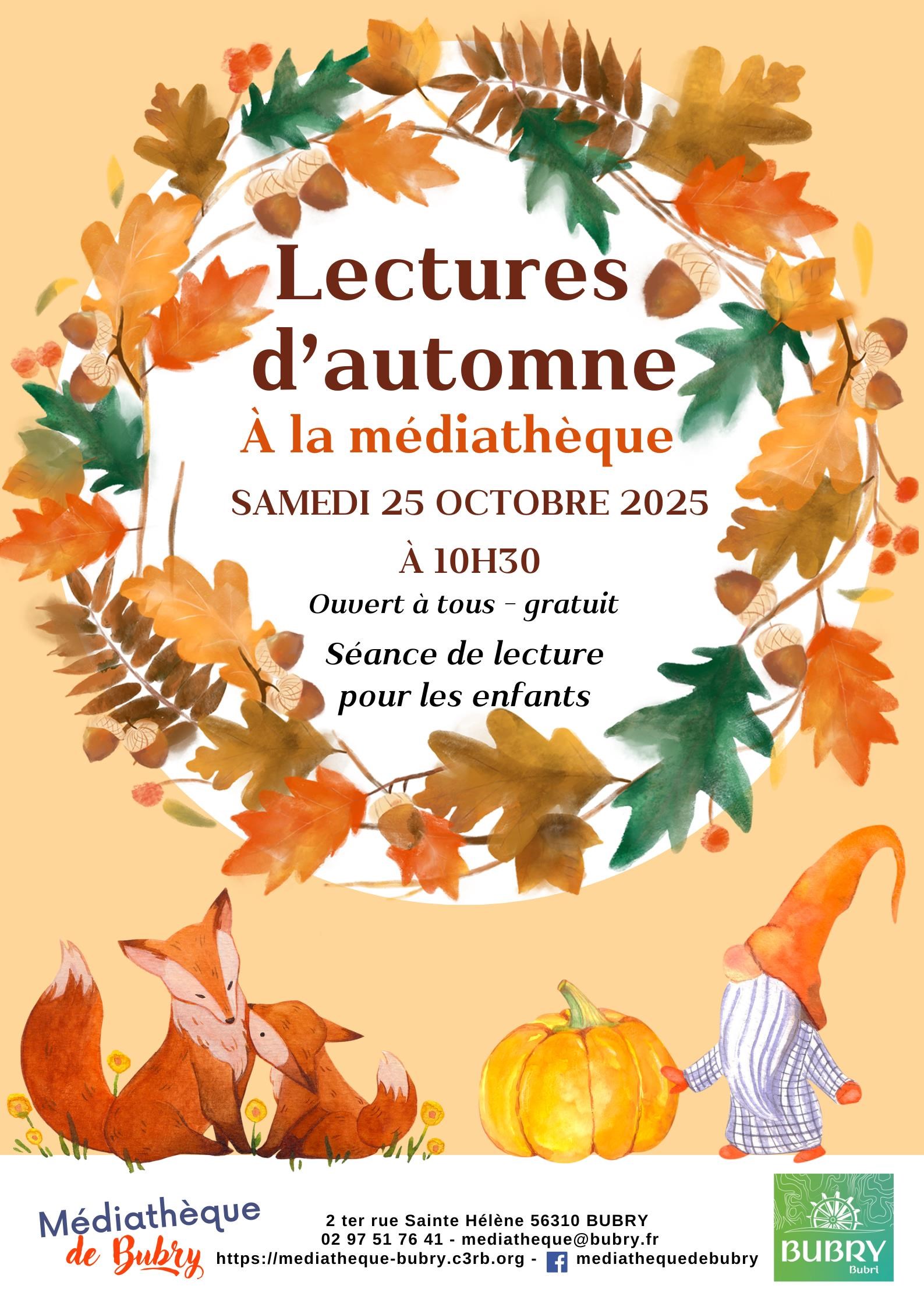Livre, Lecture. Séance de lecture pour les enfants sur le thème de l’automne. Samedi 25 octobre à 10 h 30, médiathèque, 2 ter, rue Sainte-Hélène, Bubry. Gratuit. Contact : 02 97 51 76 41, mediatheque@bubry.fr, https://mediatheque-bubry.c3rb.org/.