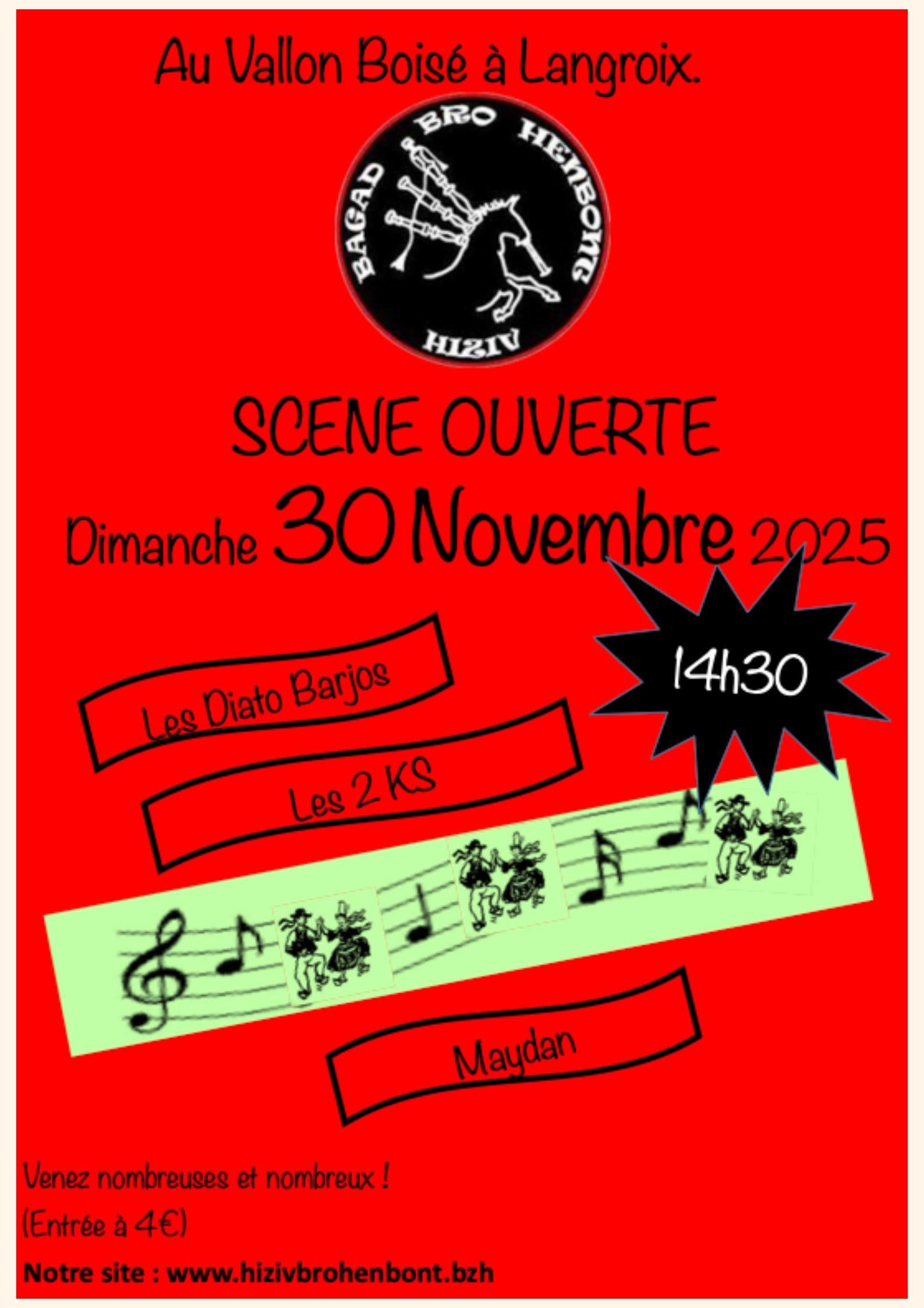 Fest-deiz. Hiziv Bro Henbont vous invite à participer à sa scène ouverte. Plusieurs groupes musicaux seront présents. Pour davantage de renseignements, consulter leur site www.hizibrohenbont.bzh. Dimanche 30 novembre de 14 h 30 à 17 h 30, salle du Vallon Boisé à Langroix, 14, rue Tagliaferi, Hennebont. Tarif 4€. Contact : 06 88 96 49 62, Contact@hizivbrohenbont.fr, https://hizivbrohenbont.bzh/.