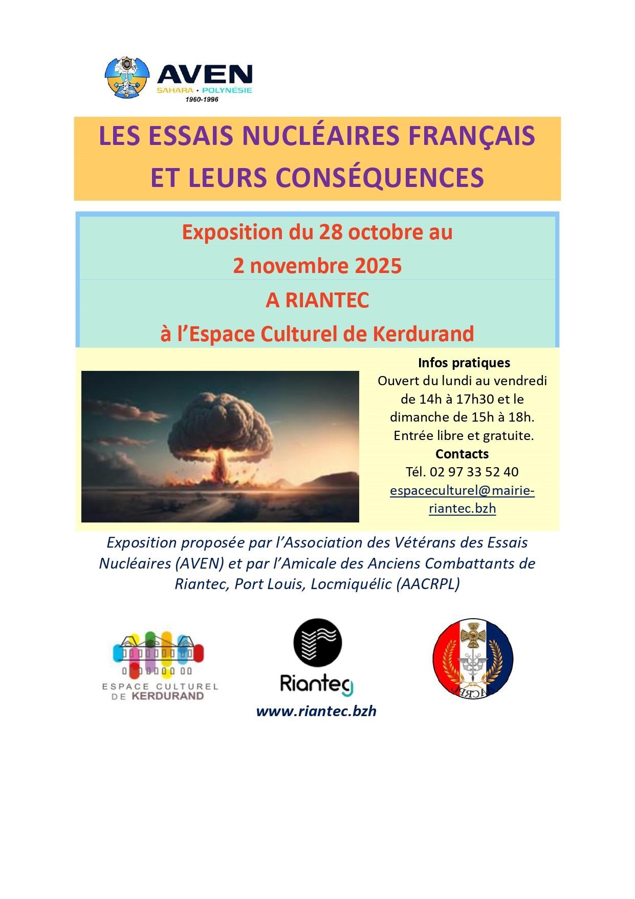 L’exposition retrace trois décennies au cours desquelles furent exposés militaires et civils à des retombées radioactives. Exposition proposée par l’Association des Vétérans des Essais Nucléaires et par l’Amicale des Anciens Combattants de Riantec, Port Louis, Locmiquélic.