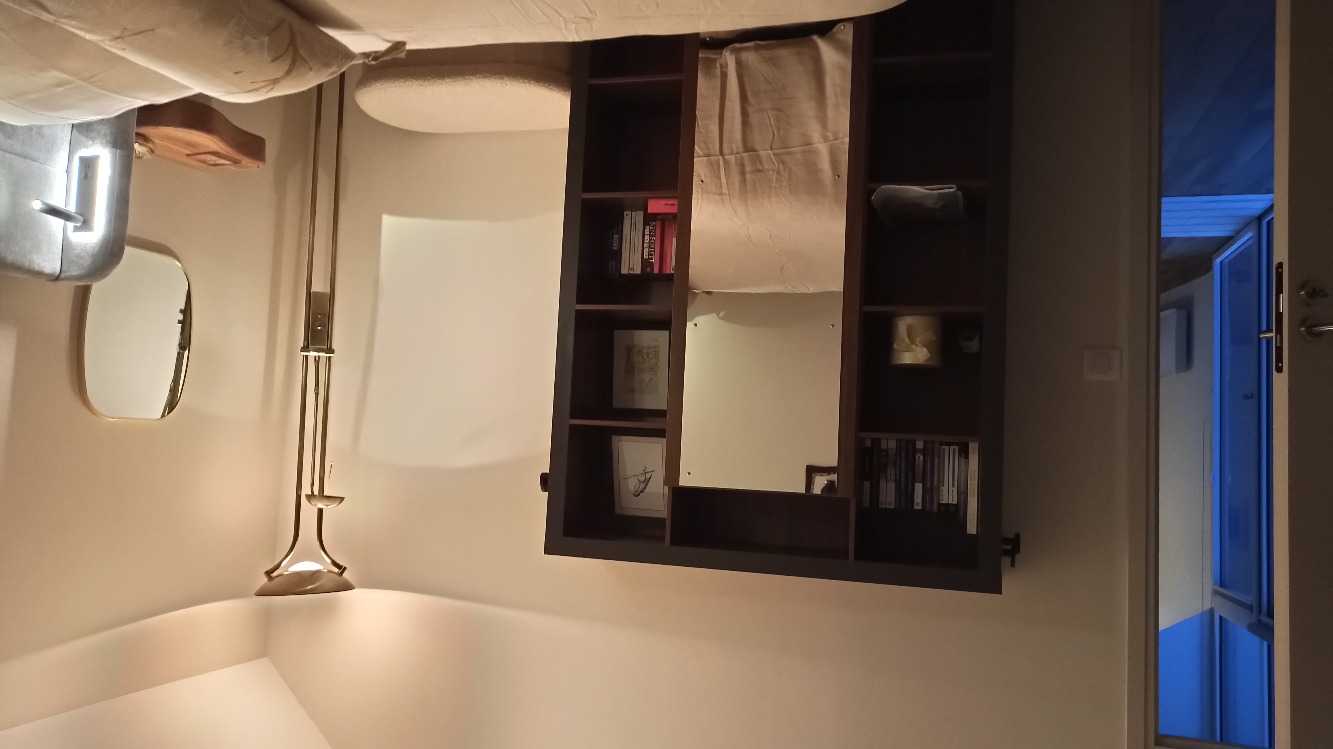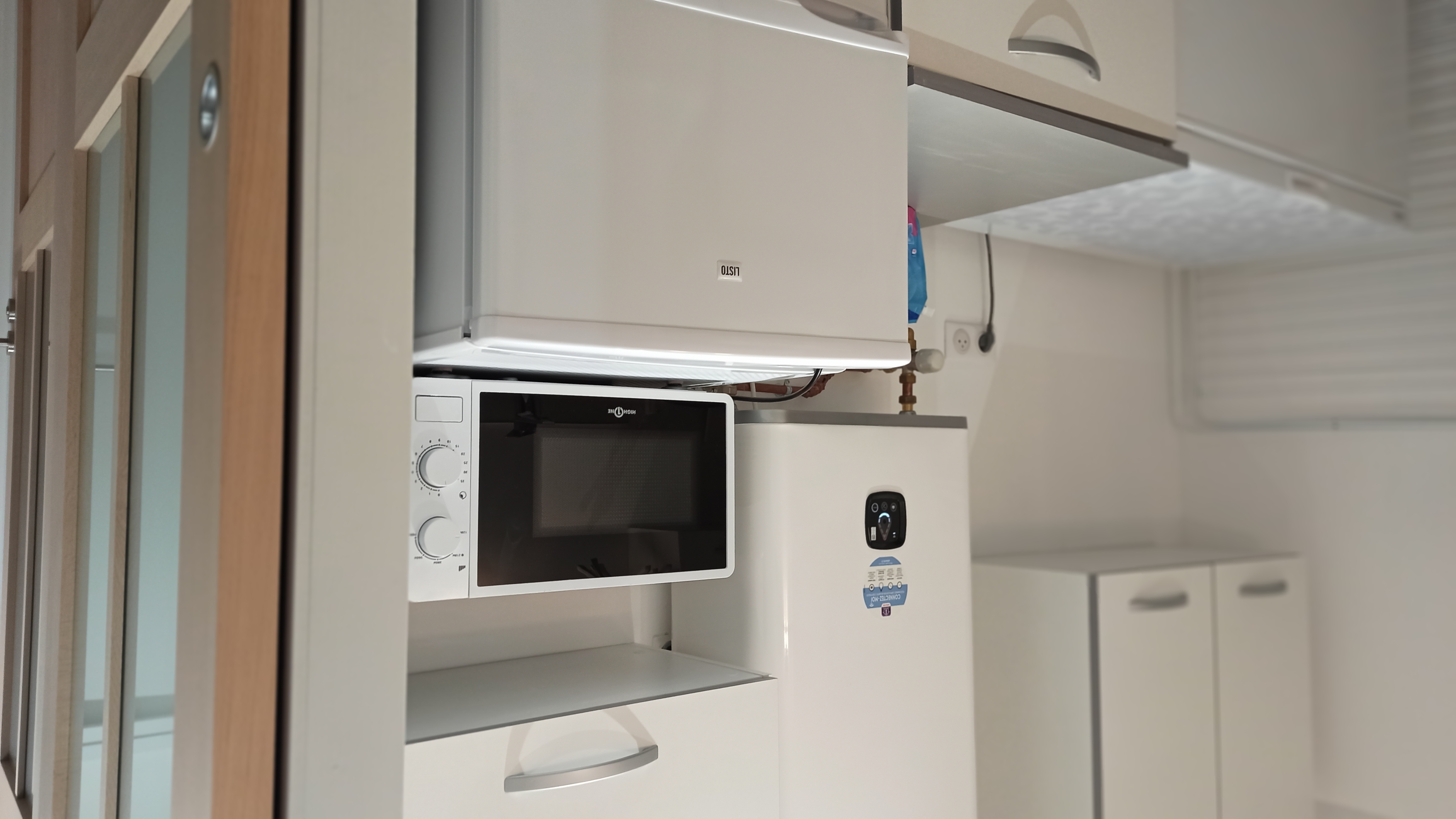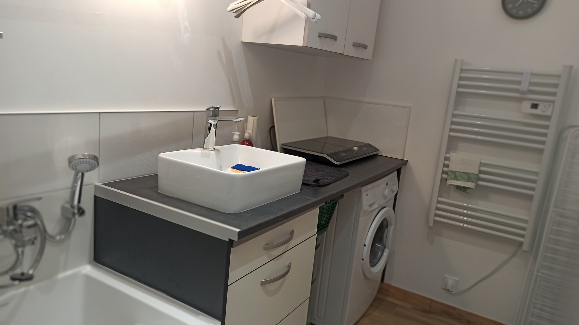 Le petit espace cuisine offre la possibilité de cuisiner et déjeuner légèrement dans la location. Plaques chauffantes, petite vaisselle, cafetière et bouilloire sont à disposition.
