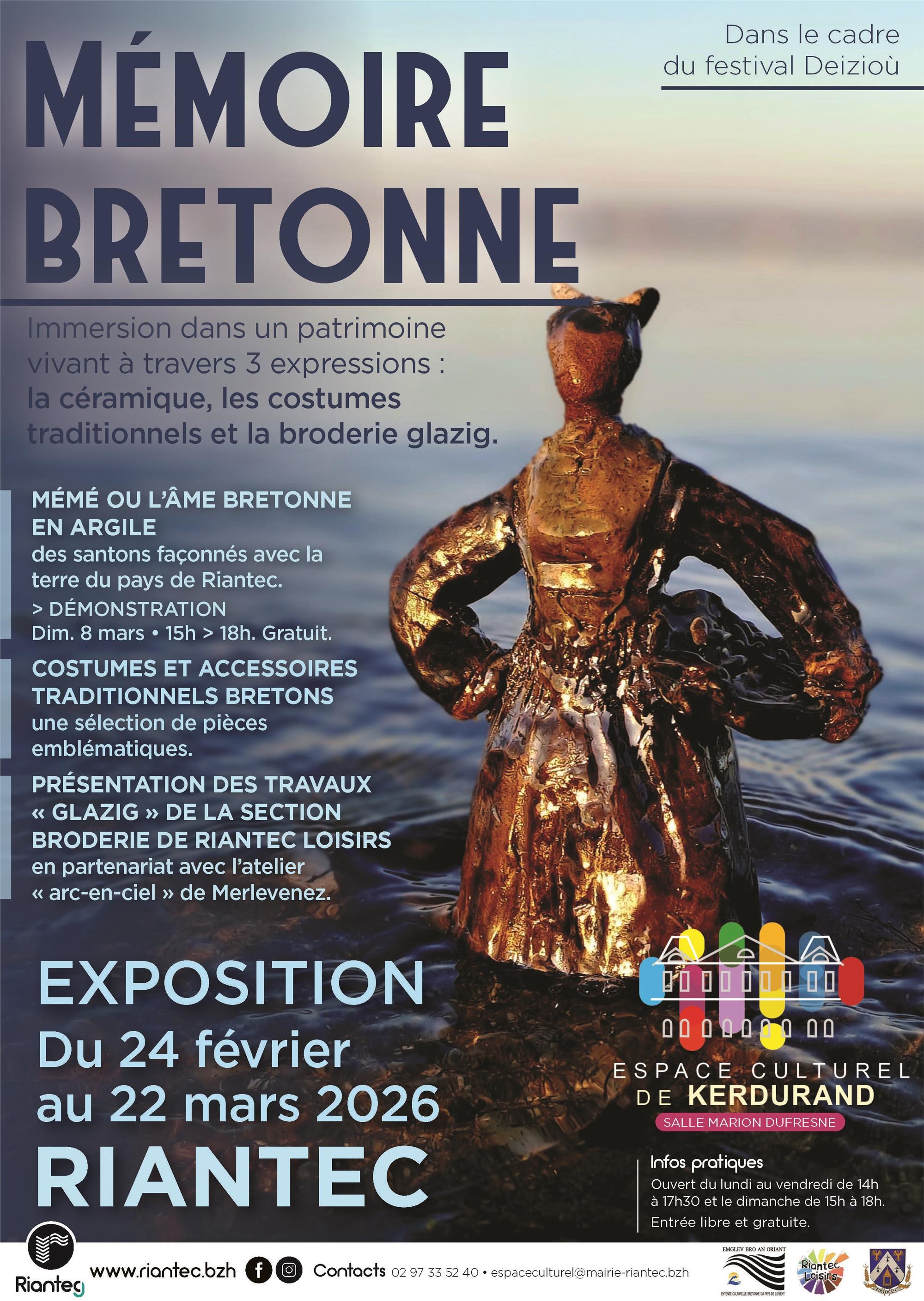 Exposition. Organisée dans le cadre des Deiziou par l’artiste Mémé et la section broderie de Riantec loisirs, cette exposition est une véritable immersion dans le patrimoine vivant breton à travers trois expressions : la céramique, les costumes traditionnels et la broderie glazig. Du mardi 24 février au dimanche 22 mars, château de Kerdurand, espace culturel, rue du Stade, Riantec. Gratuit. Contact : 02 97 33 52 40, espaceculturel@mairie-riantec.bzh.