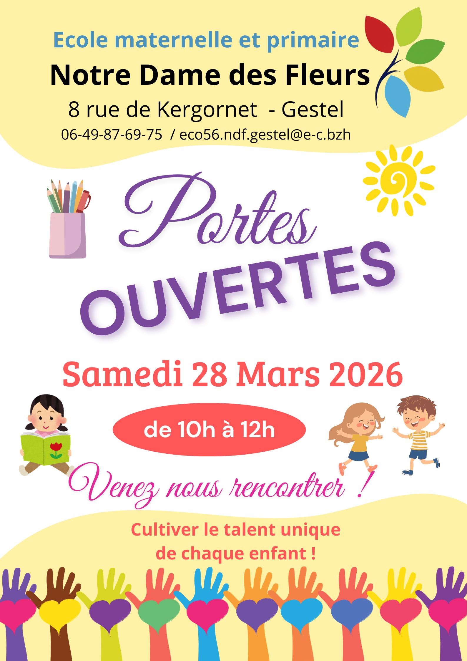 L’École Notre Dame des Fleurs à Gestel a le plaisir d’inviter toutes les familles et les futurs élèves à ses Portes Ouvertes qui se tiendront le samedi 28 mars de 10h à 12h.