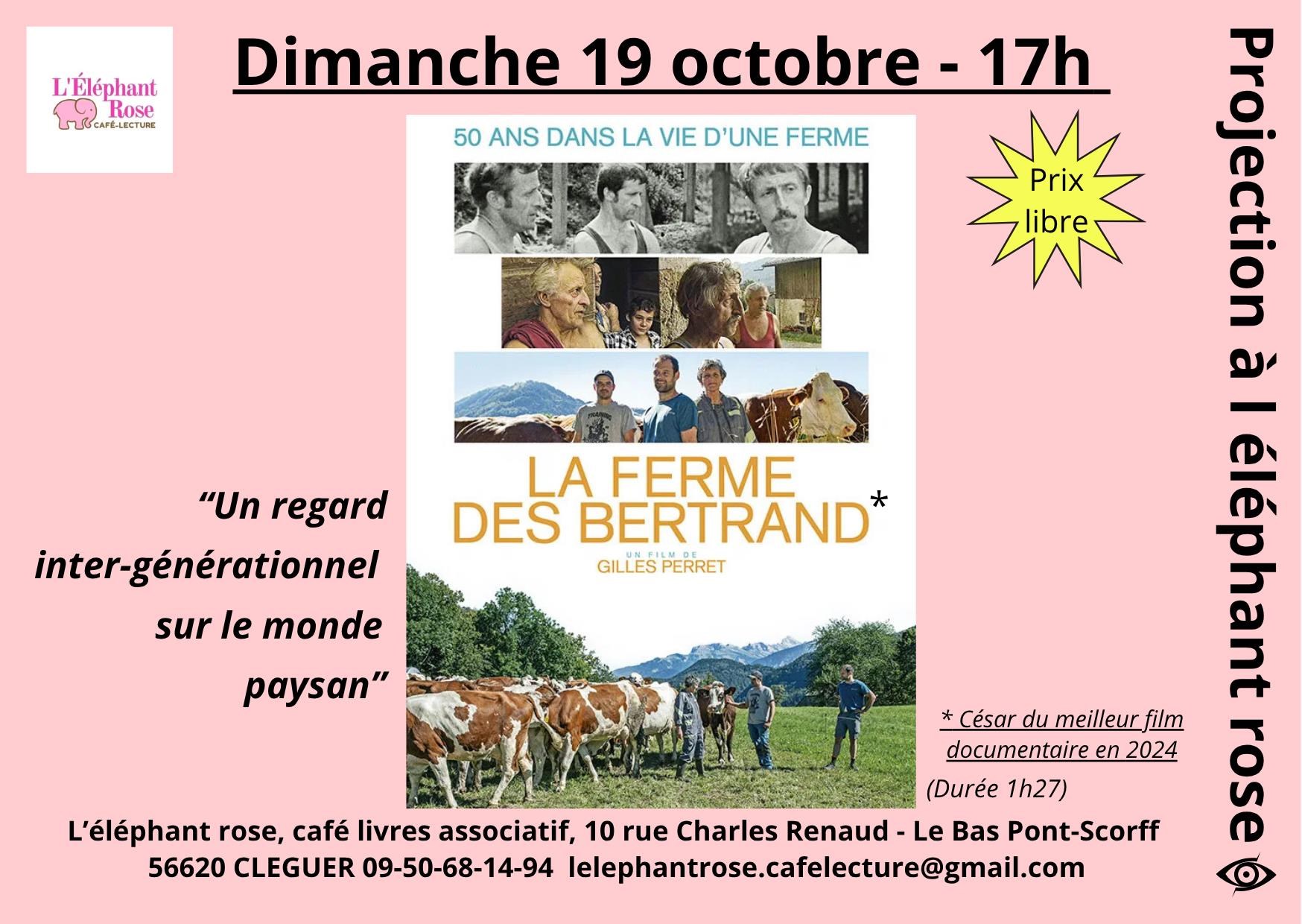 Documentaire. « La ferme des Bertrand » film de Gilles Perret, 2024, 1 h 27. Un regard intergénérationnel sur le monde paysan. Dimanche 19 octobre de 17 h à 19 h, Bas Pont-Scorff, 10, rue Charles-Renaud, Cléguer. Tarif : libre. Contact : 09 50 68 14 94, lelephantrose.cafelecture@gmail.com.