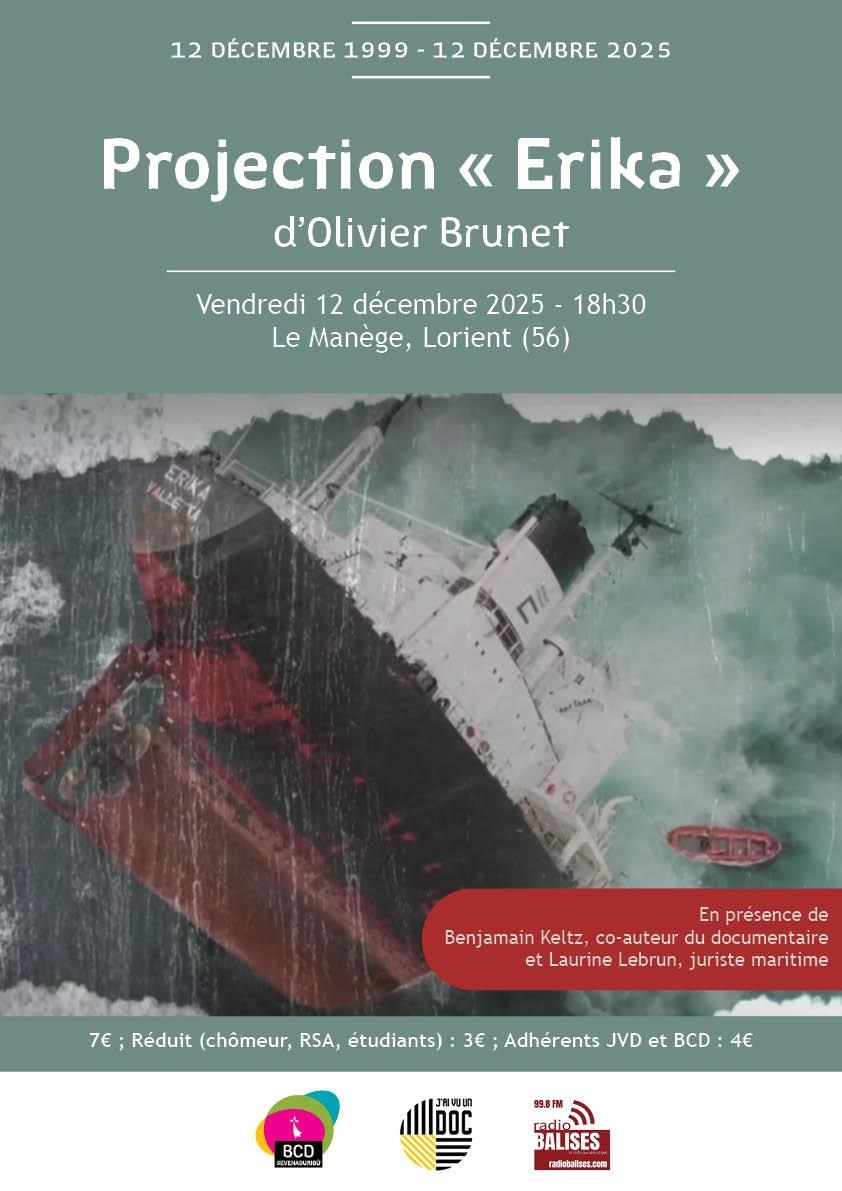 Bretagne culture diversité et J’ai vu un documentaire vous proposent la projection du film documentaire ‘’Erika’’, en deux épisodes lors de la soirée. La projection sera suivie d’une rencontre avec Benjamin Keltz, coauteur du documentaire et Laurine Levrun, juriste maritime.