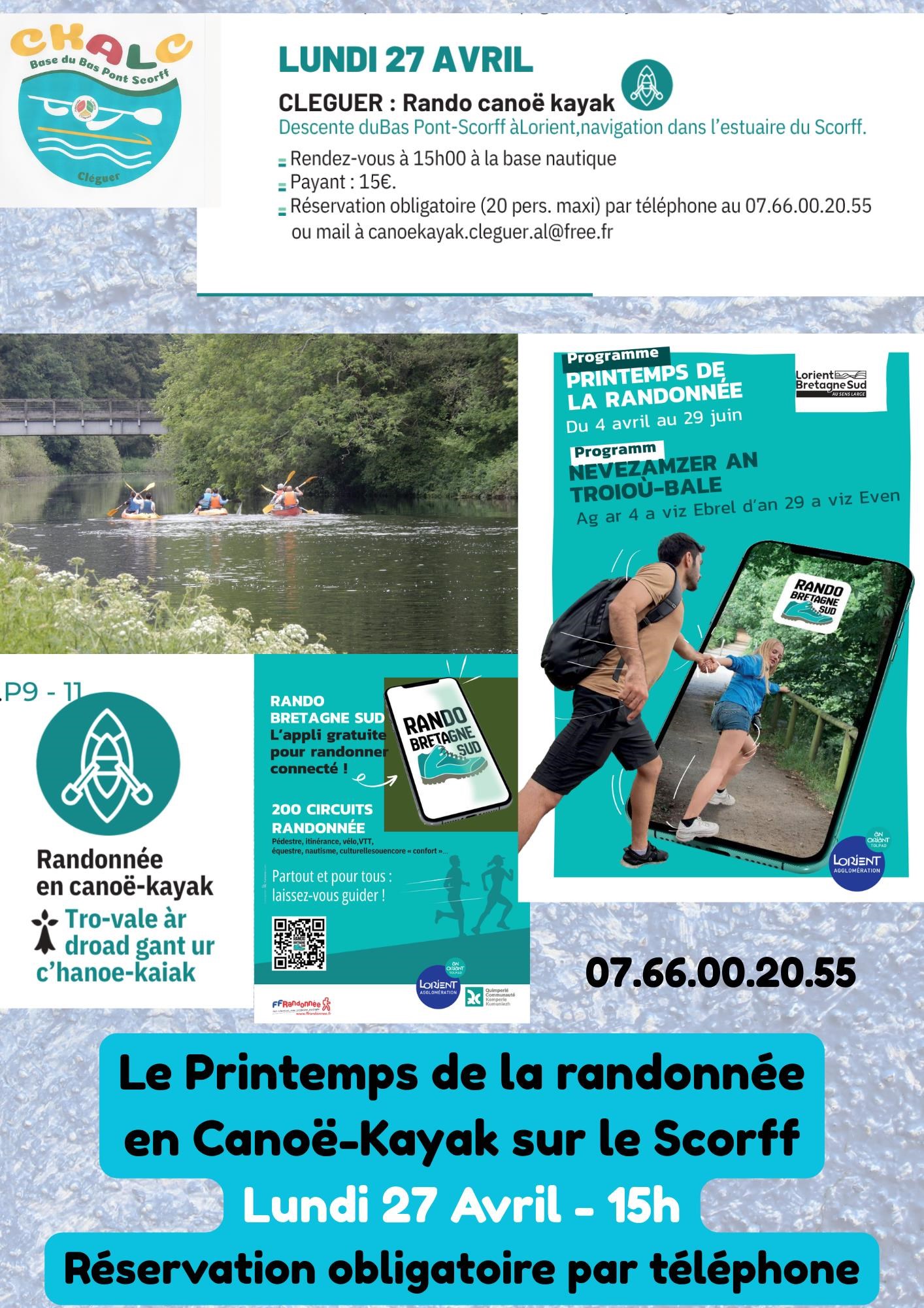 Pour le Printemps de la randonnée et en partenariat avec Lorient Agglomération, sortie en eau calme sur 10 km d’une durée de 2 h 30 environ, en autonomie. Inscription par téléphone obligatoire. Le tarif est réduit pour cette occasion. Nombre de places limité. Lundi 27 avril à 15 h, base nautique, 20, rue du Palud, Cléguer. Tarif 15€. Contact : 07 66 00 20 25, https://amicale-laique-cleguer.assoconnect.com/page/1000285-balade-sur-le-scorff-en-canoe-kayak.