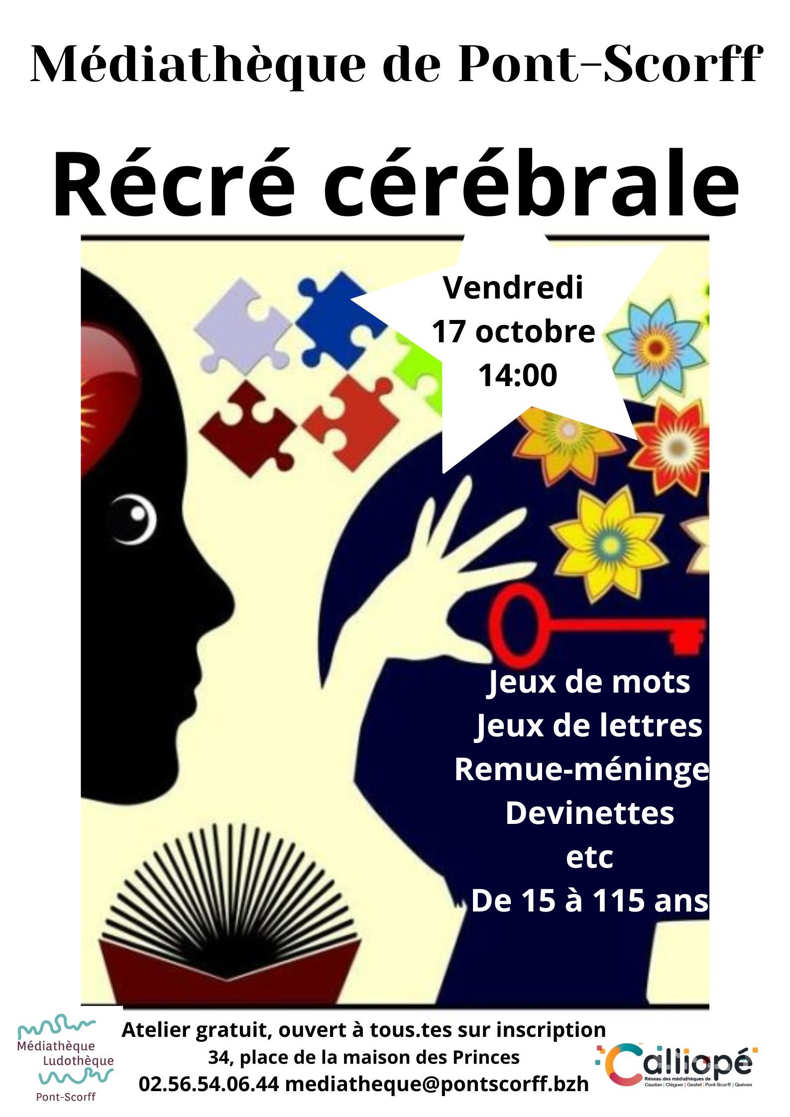 Dictée. Jeux de mots, jeux de lettres, remue-méninges, devinettes, dictées, etc. Animation menée par une bénévole de la médiathèque. De 15 à 115 ans, inscription conseillée. Vendredi 17 octobre de 14 h à 16 h, médiathèque ludothèque, 34, place de la Maison-des-Princes, Pont-Scorff. Gratuit. Contact : 02 56 54 06 44, mediatheque@pontscorff.bzh, http://calliope.bzh.